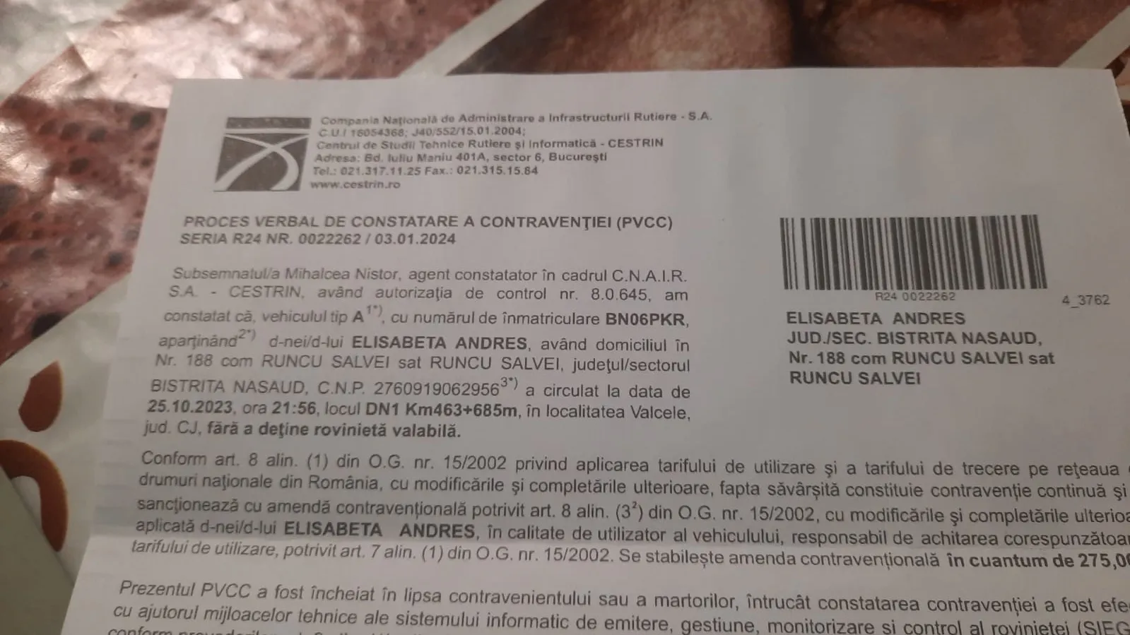 Acesta a primit o amendă nouă, joi, 25 ianuarie, și acum va trebui să o achite. Cel care deține mașina a fost prins fără rovignietă în Vâlcele, județul Cluj, dar amenda s-a dus la vechiul proprietar, în Bistrița.