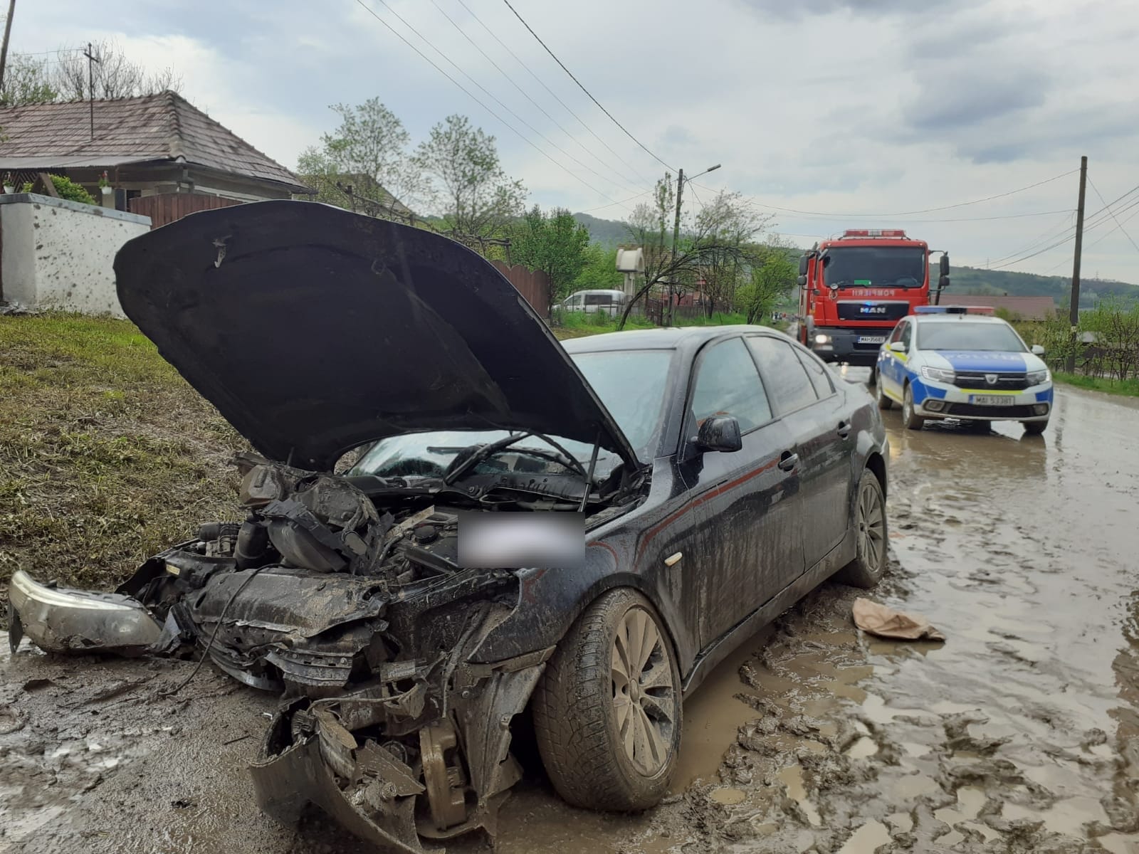 Un BMW a derapat pe noroaie în timpul furtunii și a intrat într-un cap de pod în Țaga - FOTO