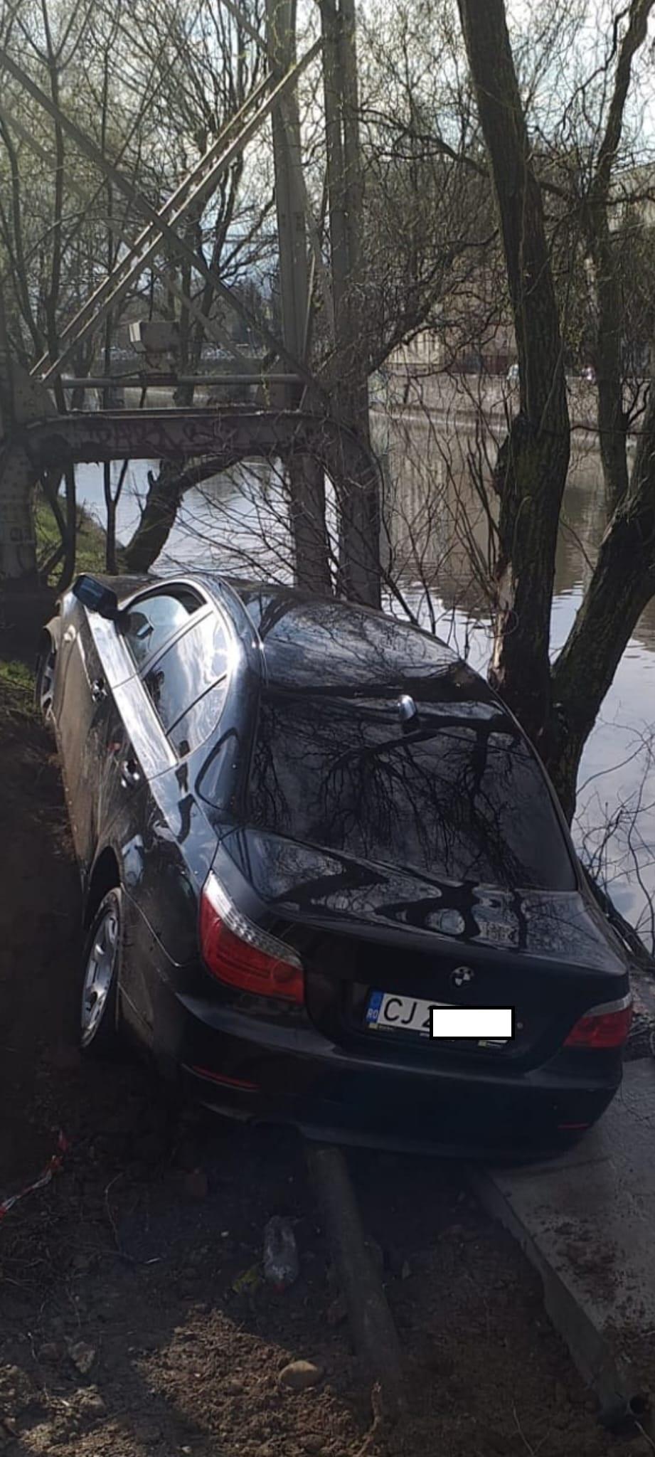 Marți, 21 martie, în timpul ploii de primăvară de la ora 15.00, șoferul unui BMW a trecut prin clipe de coșmar. Acesta circula spre podul Garibaldi, a derapat și a căzut pe malul Someșului. Norocul lui a fost că mașina s-a oprit în stâlpul de înaltă tensiune de pe marginea drumului.