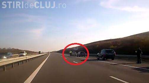 Șoferul unui BMW a fost filmat pe Autostrada Transilvania după ce a depășit pe linia continuă, fiind în mare grabă.