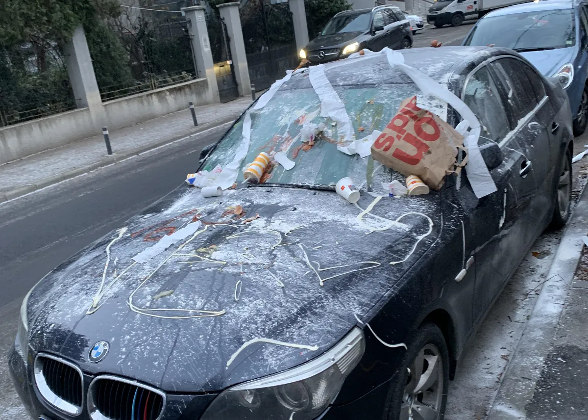 Un BMW parcat în Cluj-Napoca a fost atacat cu mâncare de la McDonalds: ”A blocat o cale de acces” - FOTO