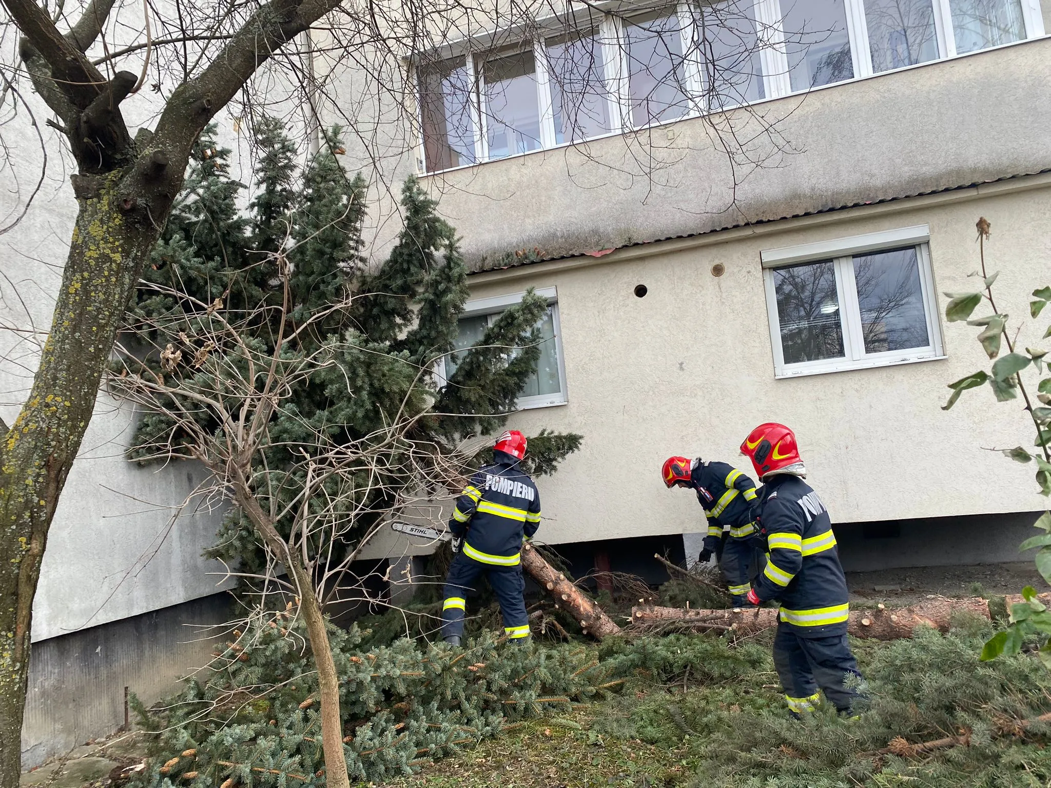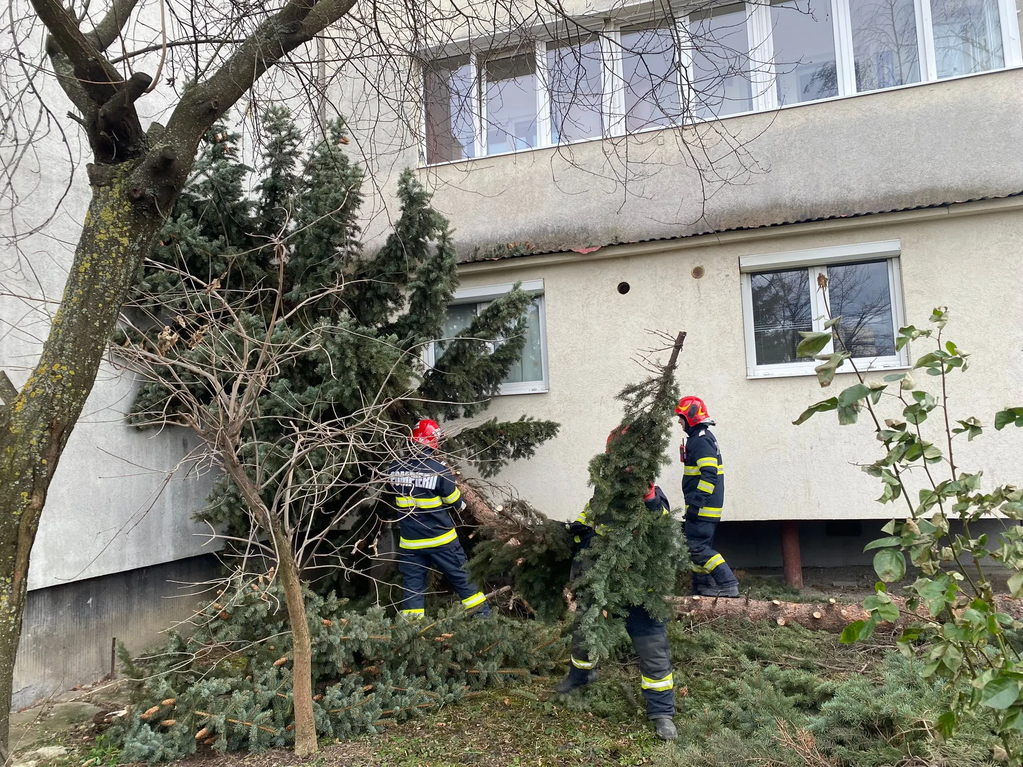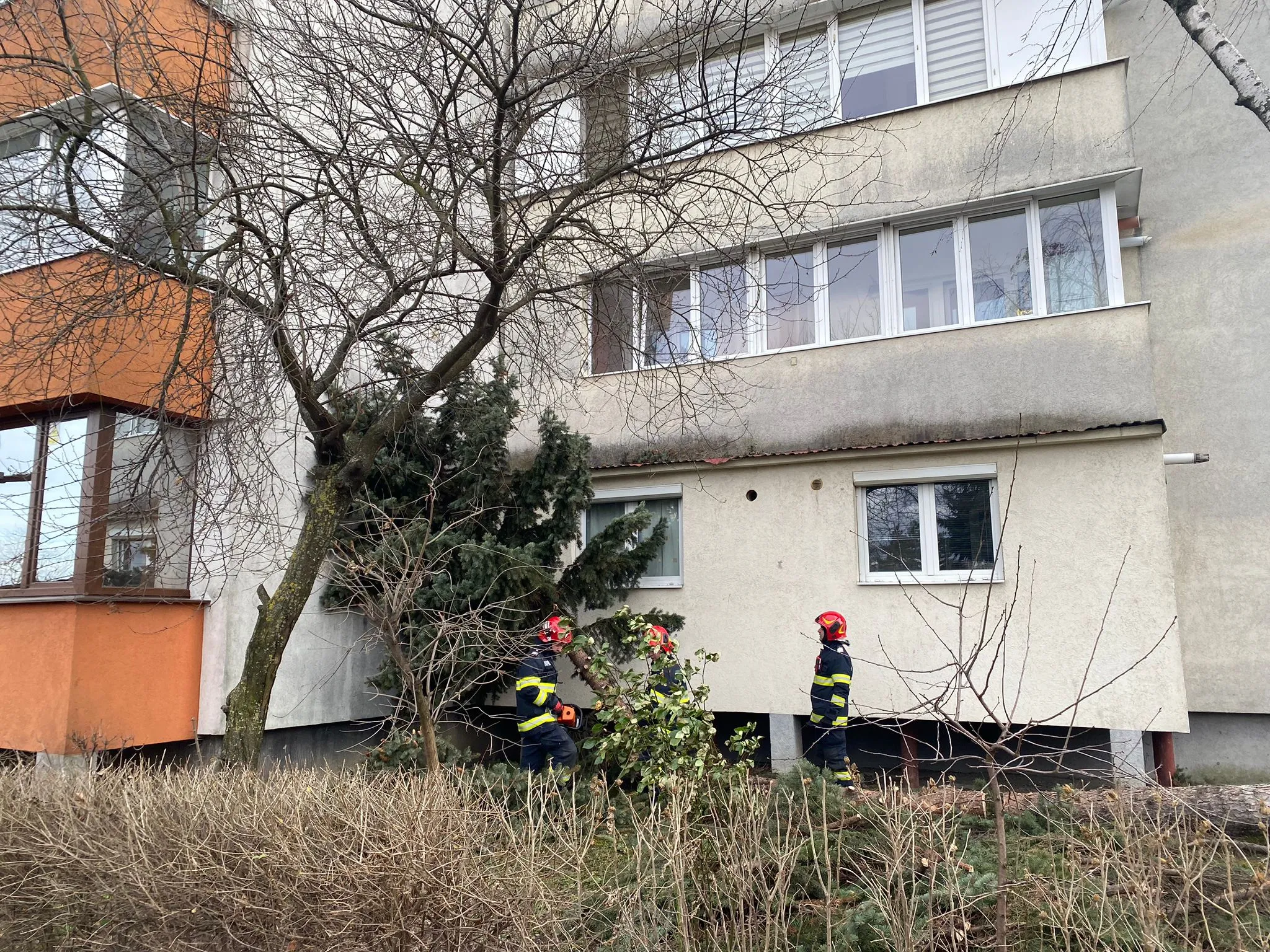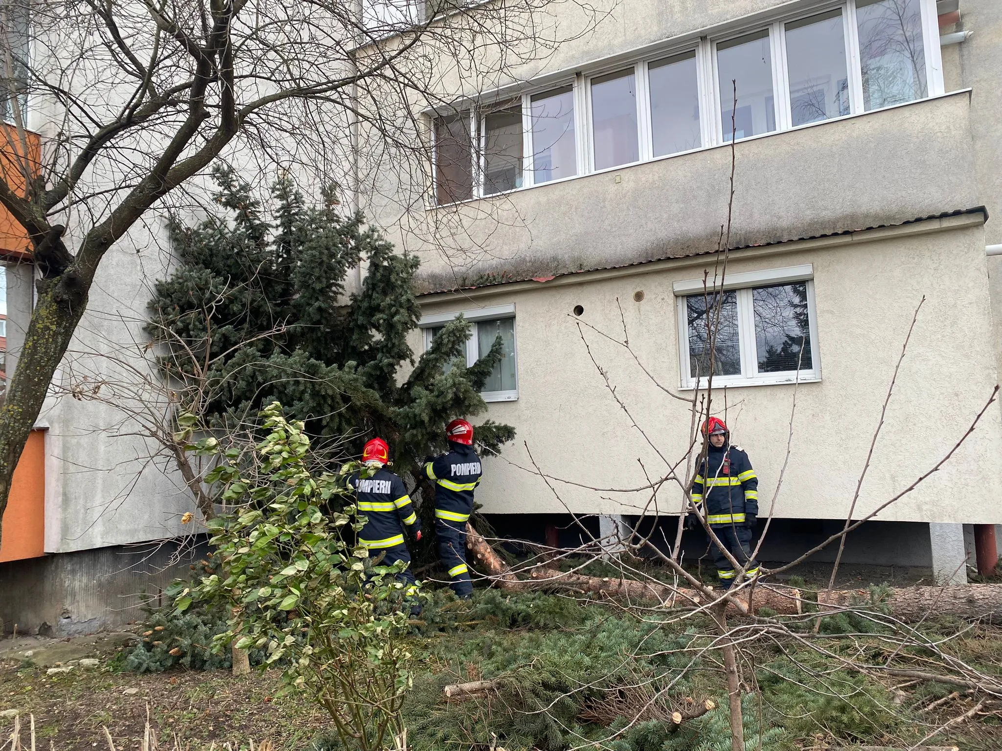Incidentul s-a produs luni, în jurul orei 13.30. Bradul s-a rupt din cauza vântului și a căzut peste fațada blocului. Pompierii au intervenit și au tăiat bradul, urmând ca acesta să fie dus de acolo.