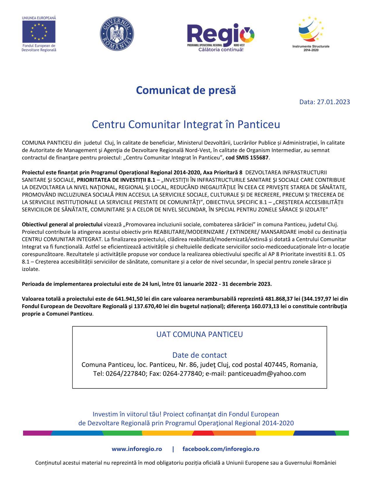 Un Centru Comunitar Integrat va fi înființat în comuna Panticeu pentru promovarea incluziunii sociale, combaterea sărăciei