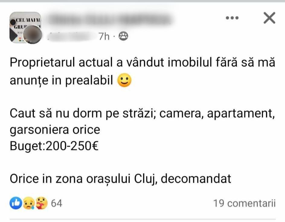 „Proprietarul actual a vândut imobilul fără să mă anunțe în prealabil. Caut să nu dorm pe străzi: camera, apartament, garsoniera orice. Buget:200-250€. Orice în zona orașului Cluj, decomandat”, a transmis tânărul pe o rețea de socializare.