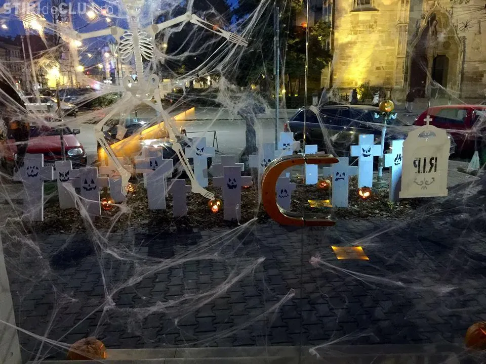 Un club clujean a realizat un DECOR macabru în plin DOLIU Național. Trotuar plin de cruci și morminte - FOTO