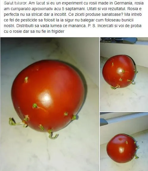 ”Am facut si eu un experiment cu rosii made in Germania, rosia am cumparato aproximativ acu 5 saptamani. Uitati si voi rezultatul. Rosia e perfecta nu s-a stricat dar a incoltit. Ce ziceti produse sanatoase? Ma intreb ce fel de pesticide sa folosit la ia sigur nu balegar cum foloseau bunicii nostri. Distribuiti sa vada lumea ce mananca. P. S. Incercati si voi de proba cu o rosie, dar sa nu fie in frigider”, a transmis clujeanul, pe Facebook.