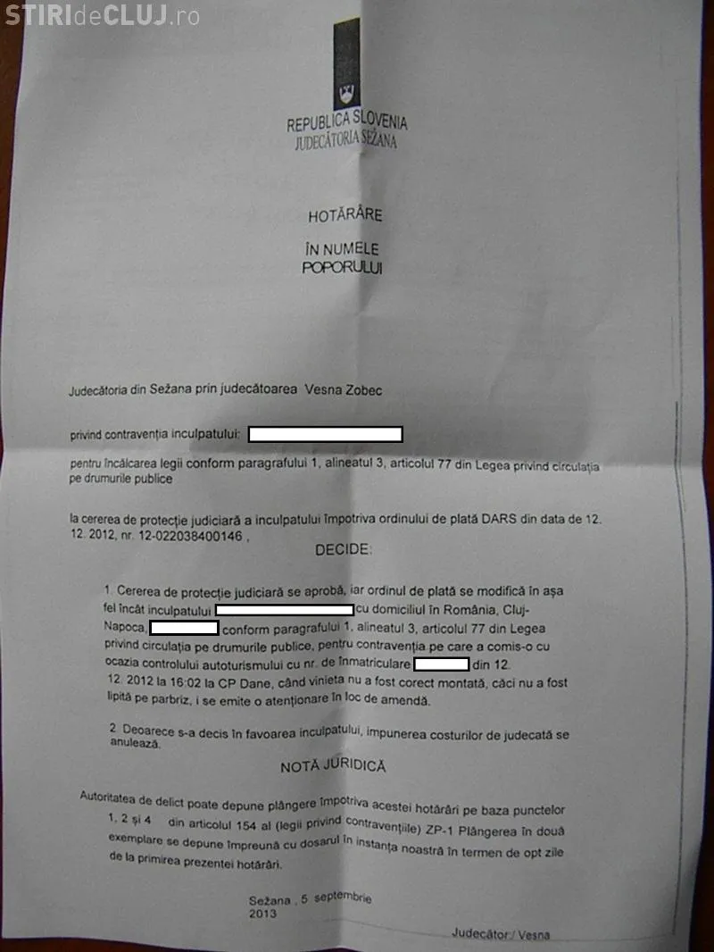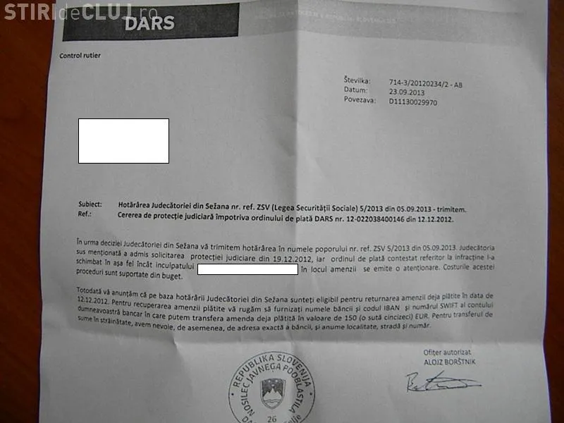 Totodată vă anunțăm că pe baza hotărârii judecătorești din Sezana sunteți eligibil la returnarea amenzii deja plătite în data de 12.12.2012. Pentru recuperarea amenzii plătite vă rugăm să furnizați contul dumneavoastră bancar în care putem transfera amenda deja plătită în valoare de 150 de euro”, au informat autoritățile din Slovenia.
