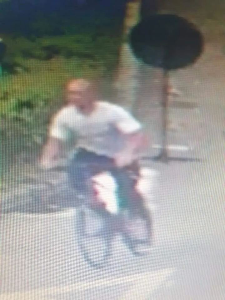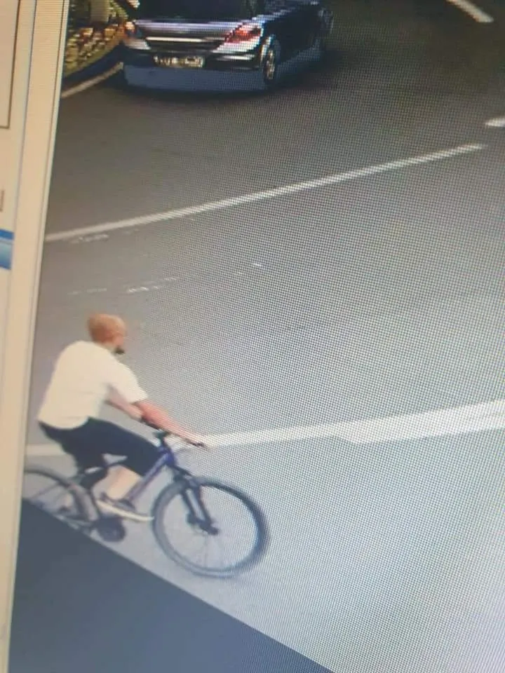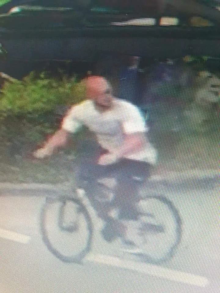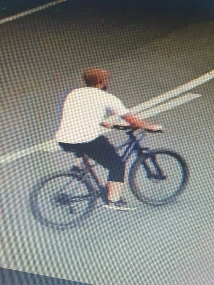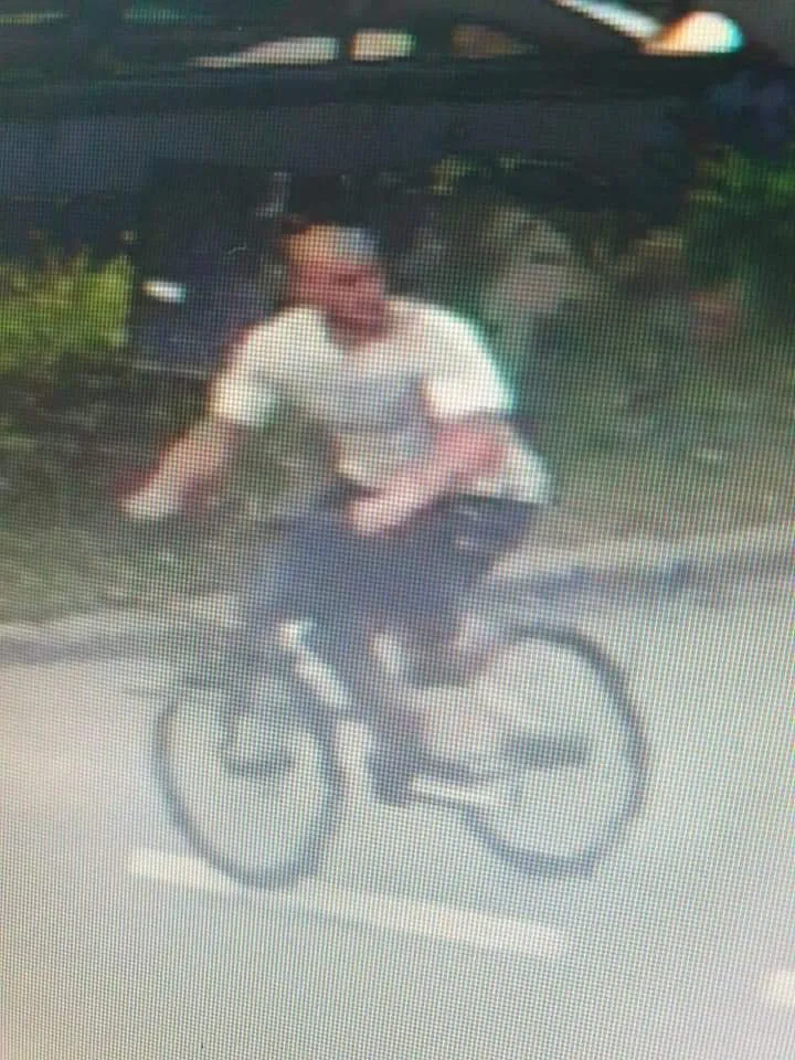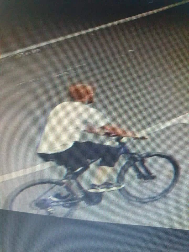 Semnalmente: început de chelie, tuns scurt pe margini, ochelari, barbă, tricou alb, pantaloni închiși de culoare trei sfert, bicicletă închisă la culoare posibil albastru, frâne pe disc.