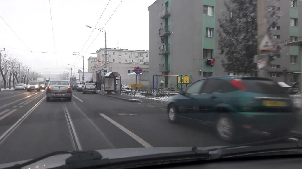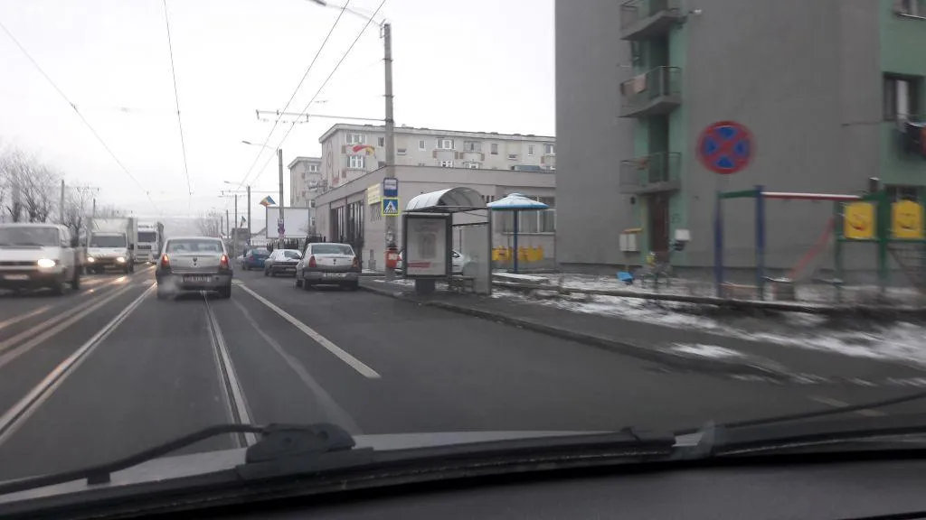 Dupa cum se poate vedea din poze, traficul este infernal, in aproape orice moment al zilei, din mai multe cauze: - statie de tramvai, statie de autobuz, trafic auto industrial (manevre TIR-uri) si parcari neregulamentare (chiar masini abandonate in zona de incidenta a indicatorului "oprirea interzisa").