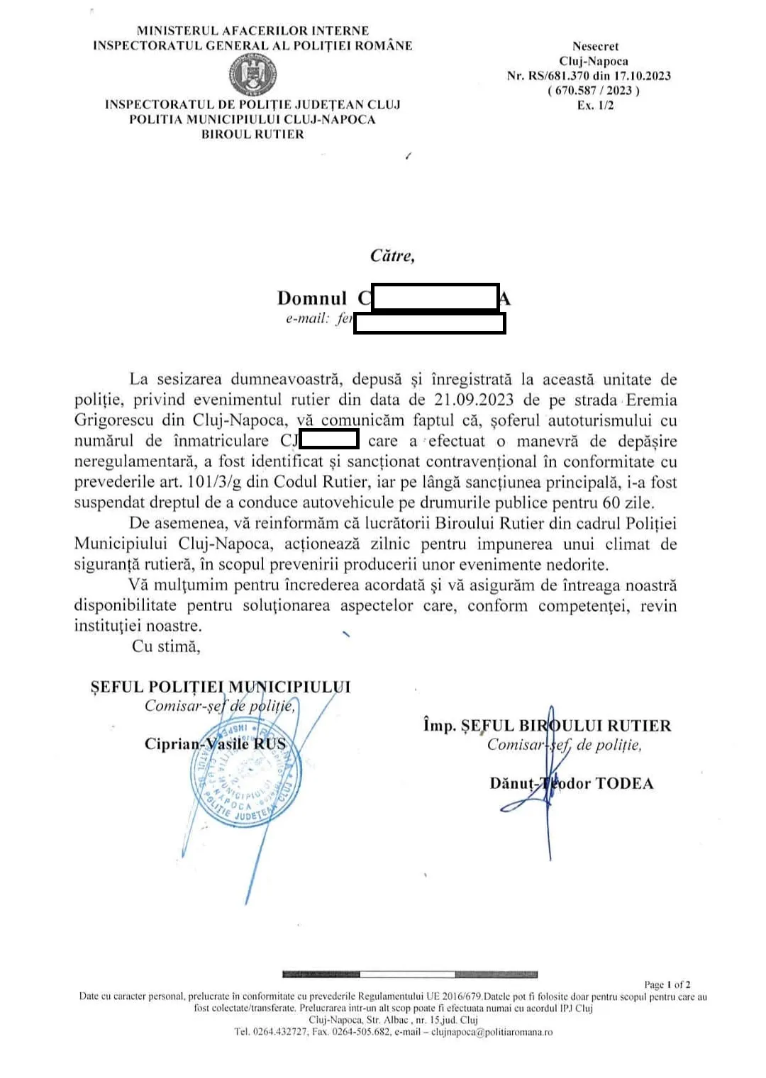 ”La sesizarea dumneavoastră, depusă și înregistrată la această unitate de poliție, privind evenimentul rutier din data de 21.09.2023 de pe strada Eremia Grigorescu din Cluj-Napoca, vă comunicăm faptul că, șoferul autoturismului cu numărul de înmatriculare CJ-2*-*** care a efectuat o manevră de depășire neregulamentară, a fost identificat și sancționat contravențional în conformitate cu prevederile art. 101/3/g din Codul Rutier, iar pe lângă sancțiunea principală, i-a fost suspendat dreptul de a conduce autovehicule pe drumurile publice pentru 60 zile.