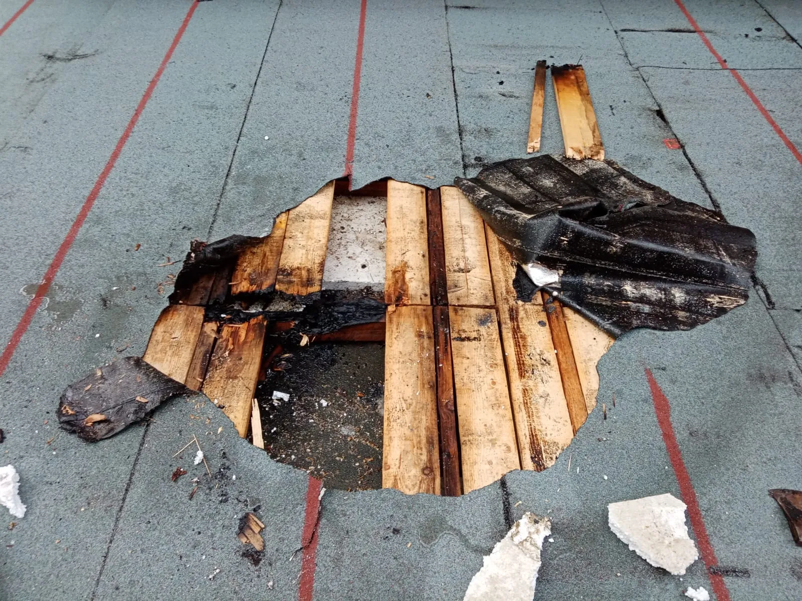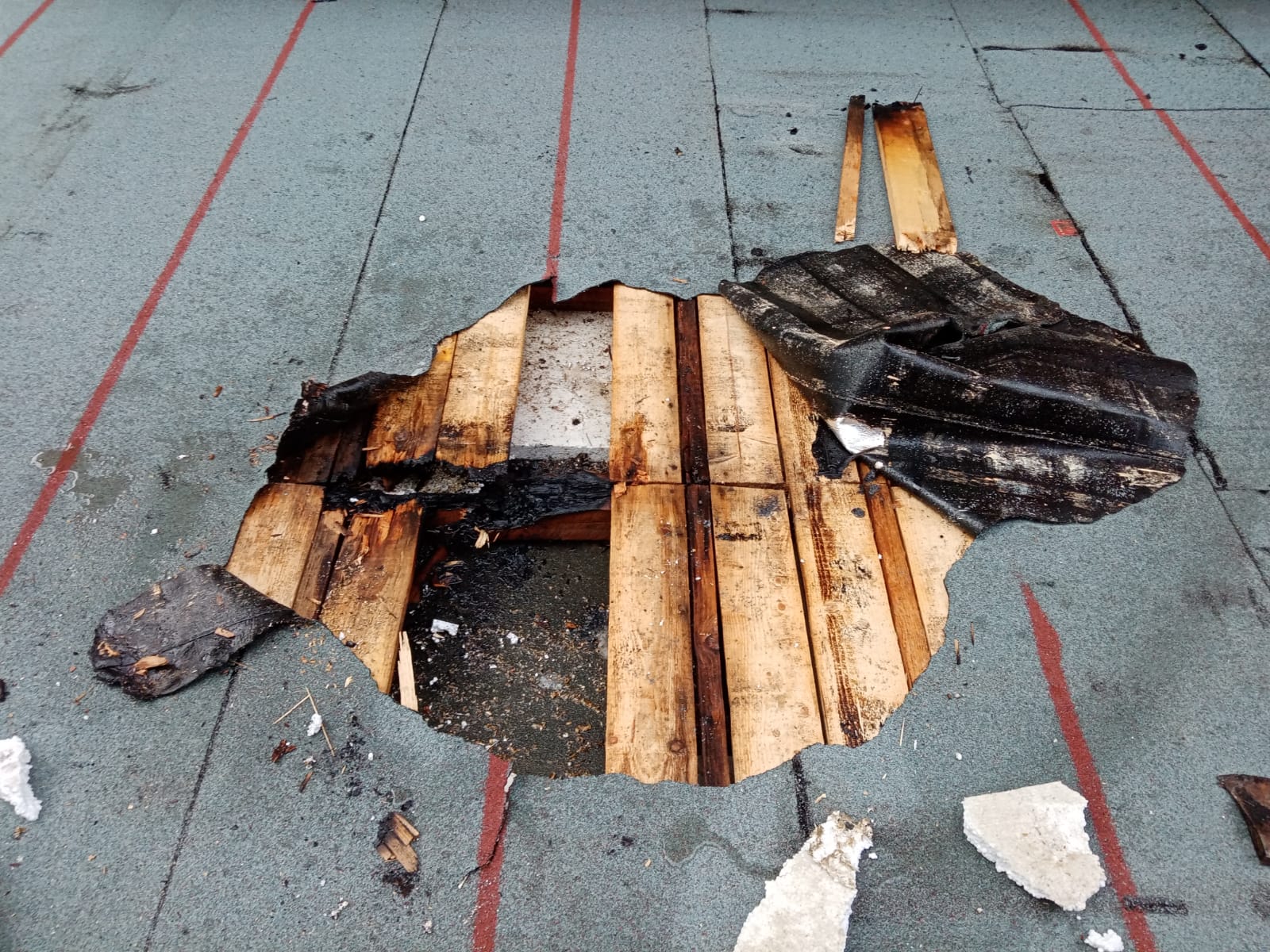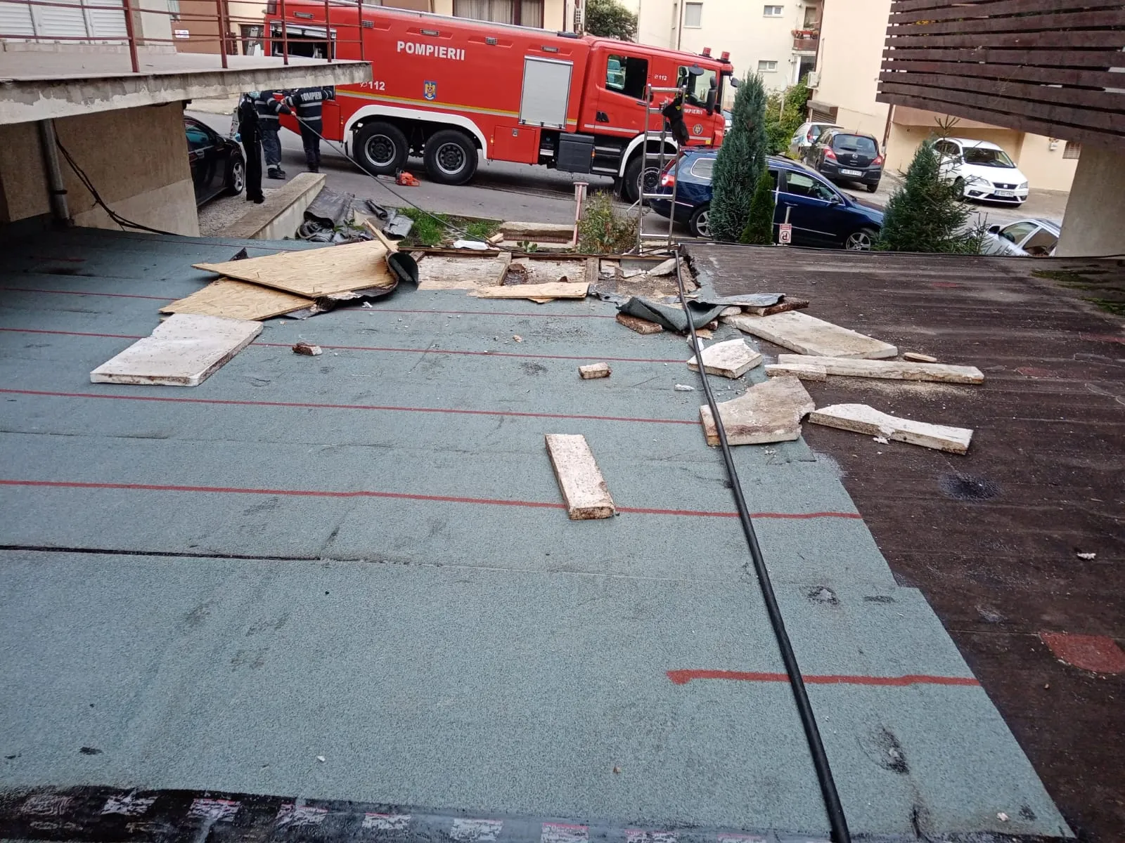 În momentul sosirii pompierilor, focul ardea mocnit în membrana bituminoasă și grinzile de lemn, care susțineau învelitoarea acoperișului.