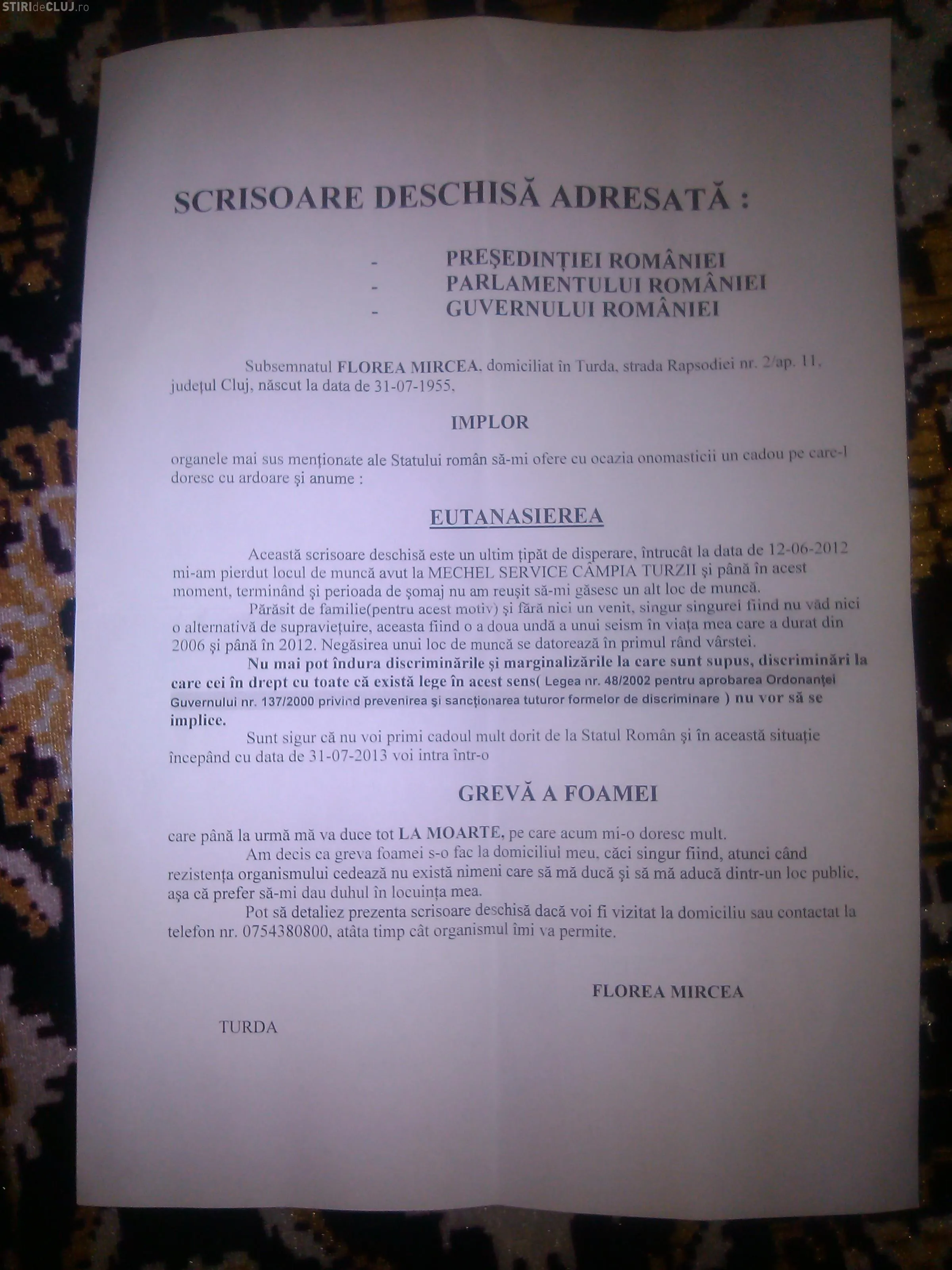 Un bărbat de 58 de ani din Câmpia Turzii a solicitat Președinției României, Parlamentului și Guvernului dreptul de a fi eutanasiat. Mircea Florea a fost concediat de unde a lucrat și nu mai are voința de a trăi.