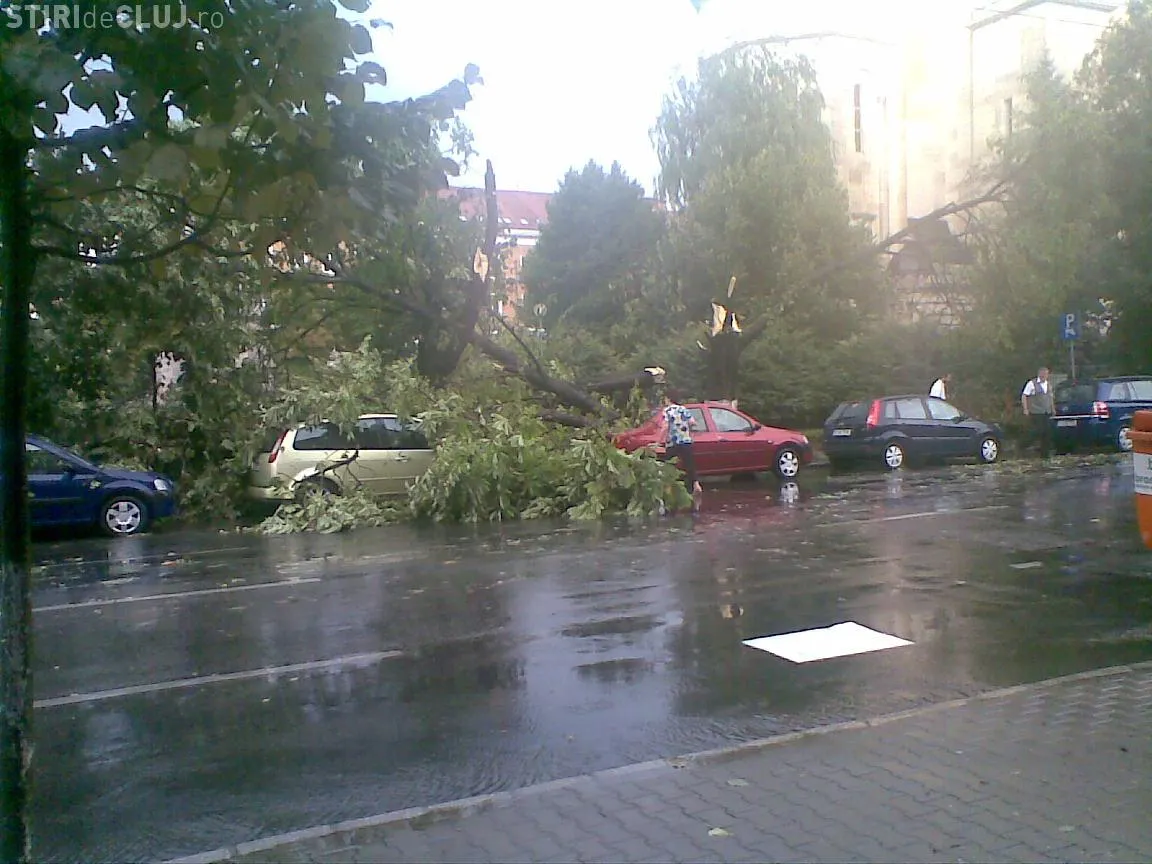 In fata Prefecturii Cluj un copac a fost culcat la pamant . Copacul a cazut peste trei masini care erau parcate in Piata Avram Iancu. Alti copaci au cazut pe strazile Observatorului, Kogalniceanu, Calea Turzii si Scarisoara.