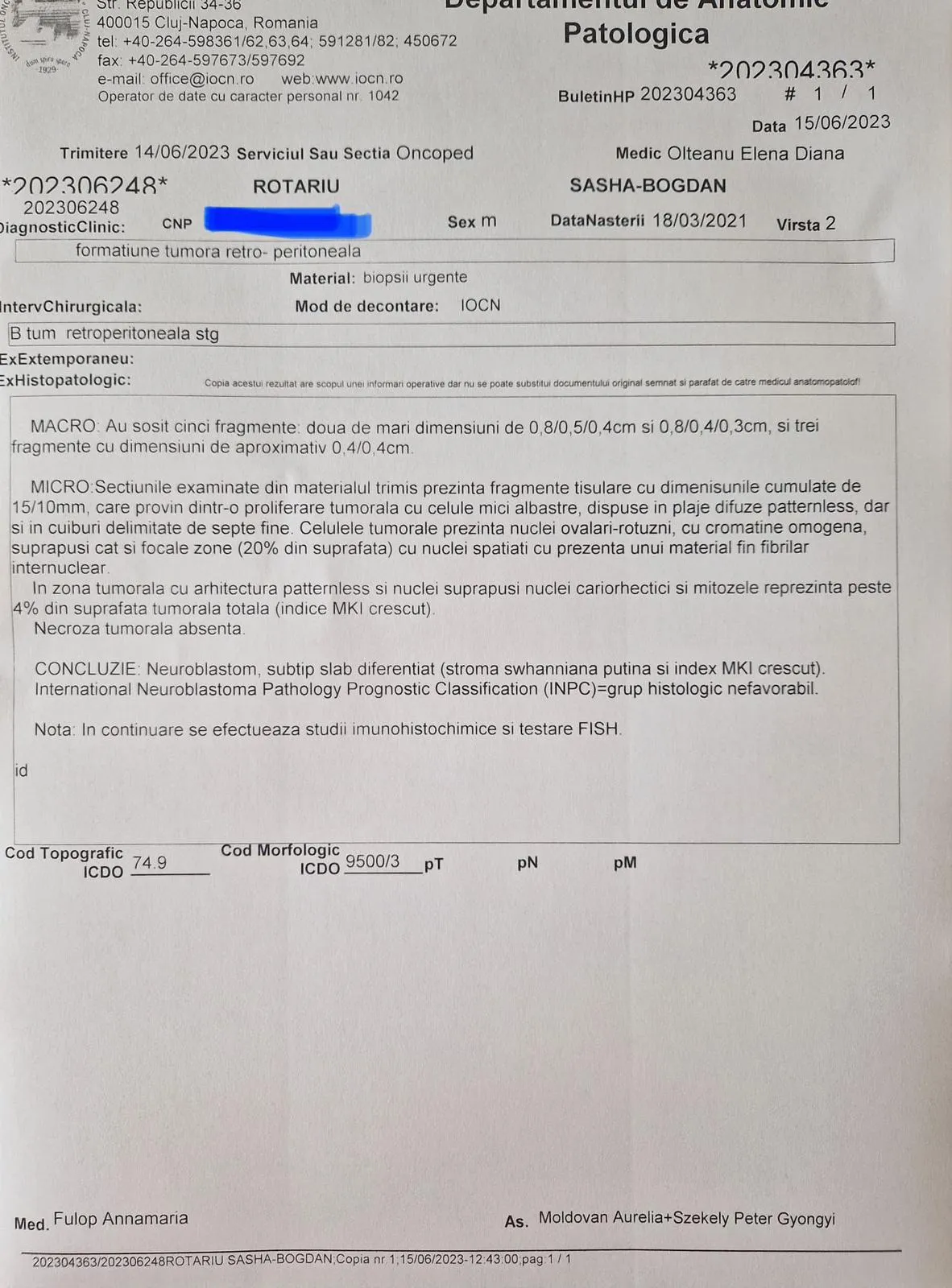 Sasha, un băiat de 2 ani, a fost diagnosticat cu cancer, având o tumoare canceroasă neuroblastom retroperitoneală stângă, de diferite dimensiuni, localizat într-un loc destul de greu de accesat (pe vasele de sânge).