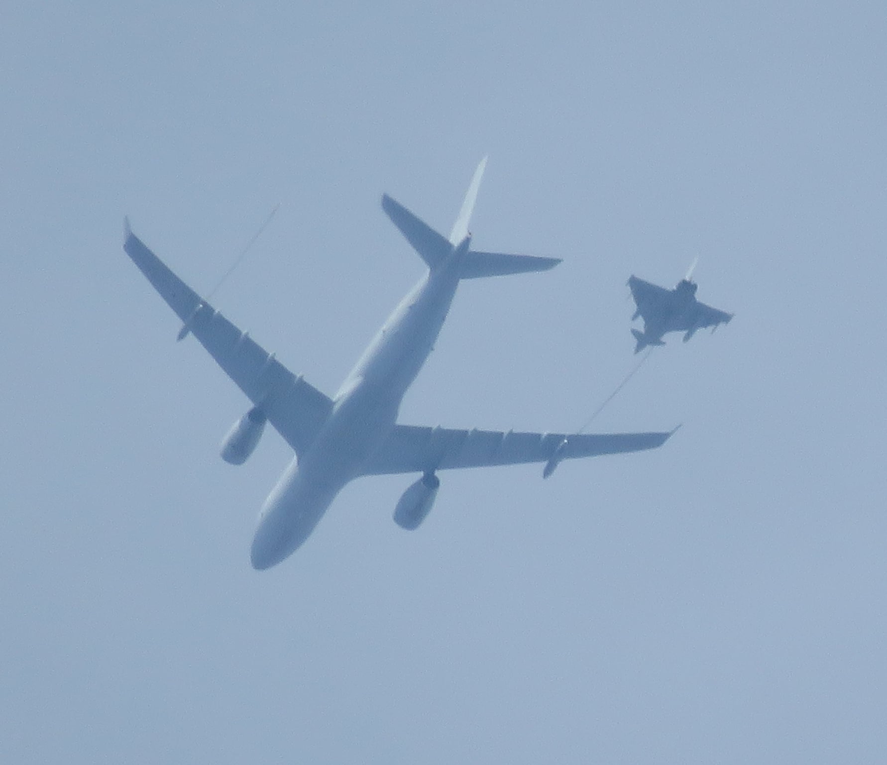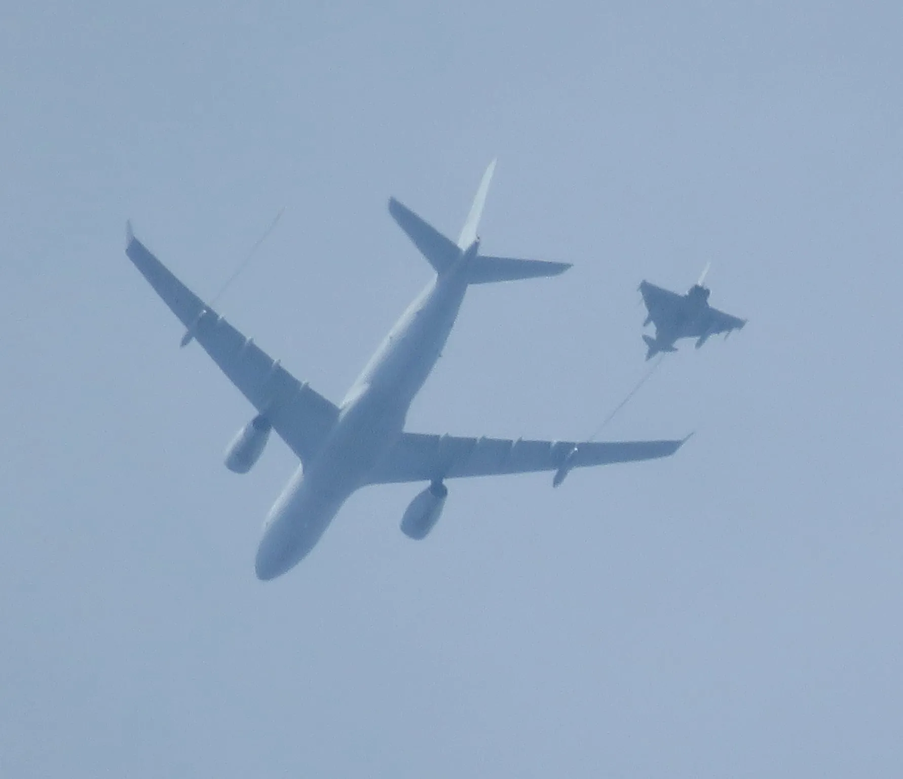 Un fotograf amator din Crainimăt, comuna Șieu-Măgheruș, județul Bistrița-Năsăud, aflată la aproximativ 50 km est de Gherla, a surprins marți o alimentare în timpul zborului, în care un Eurofighter Typhoon s-a contectat la uriașul KC 2 Voyager.