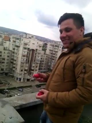 Un tânăr s-a filmat în timp ce arunca ouă de Paște de pe un bloc din Mărăști.