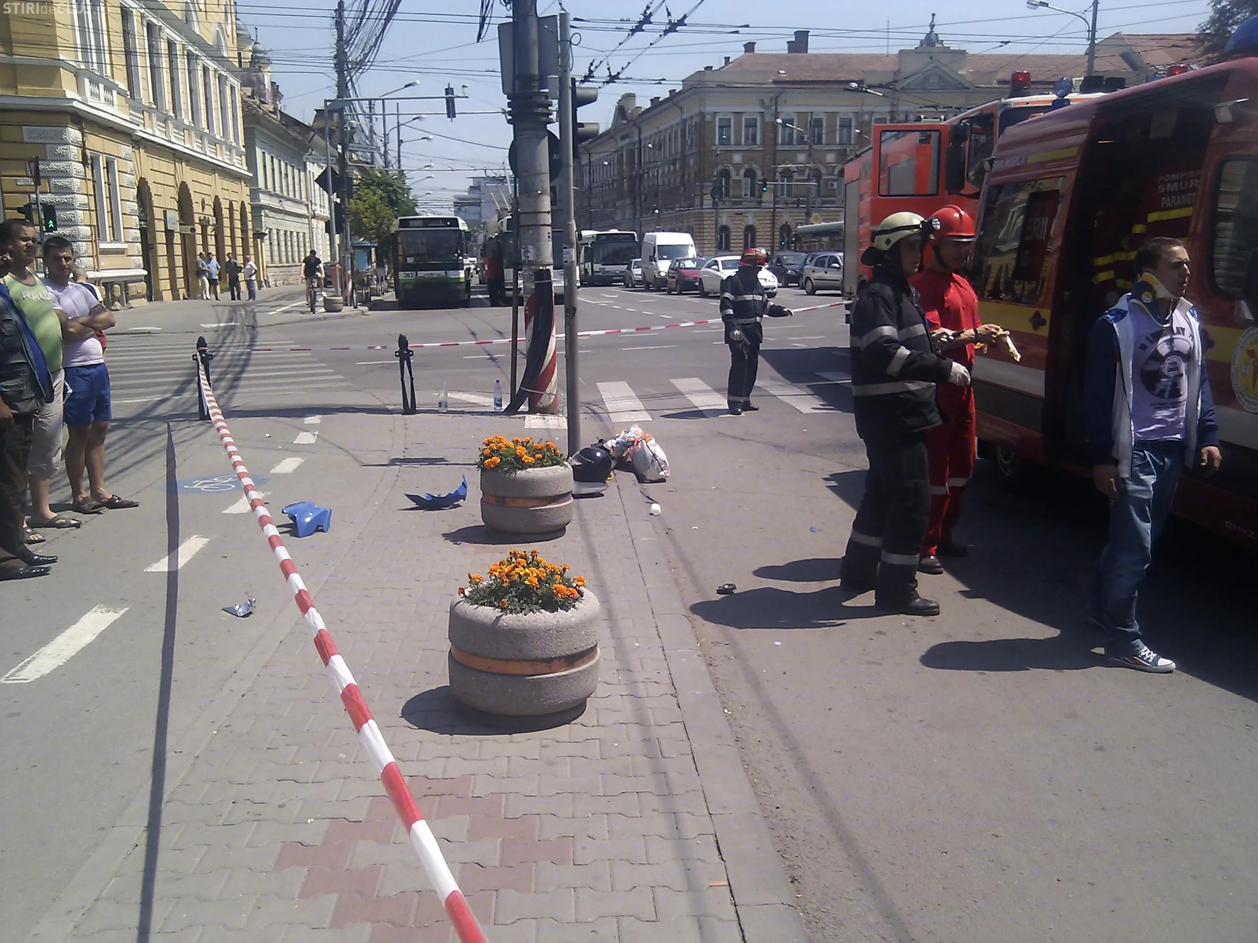 Doua femei si o fetita au fost ranite in urma unui accident produs in fata Prefecturii Cluj. Pietonii au fost prinsi pe semafor pe culoarea rosie si au fost loviti ca la popice de un motociclist.