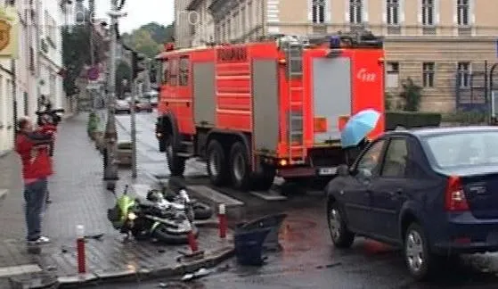 Un motociclist din Alba s-a făcut PRAF în centrul Clujului. A lovit o mașină în Piața Lucian Blaga
