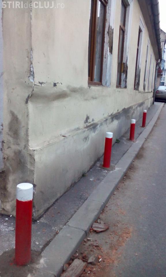Pe un trotuar cu o lățime de 30 de cm au fost ”plantați” stâlpișori metalici care îl fac astfel impracticabil.