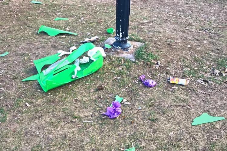 Un parc din Cluj-Napoca a fost vandalizat de ,,o persoană bolnavă”: ,,Altă treabă nu are decât să rupă coșurile de gunoi ”