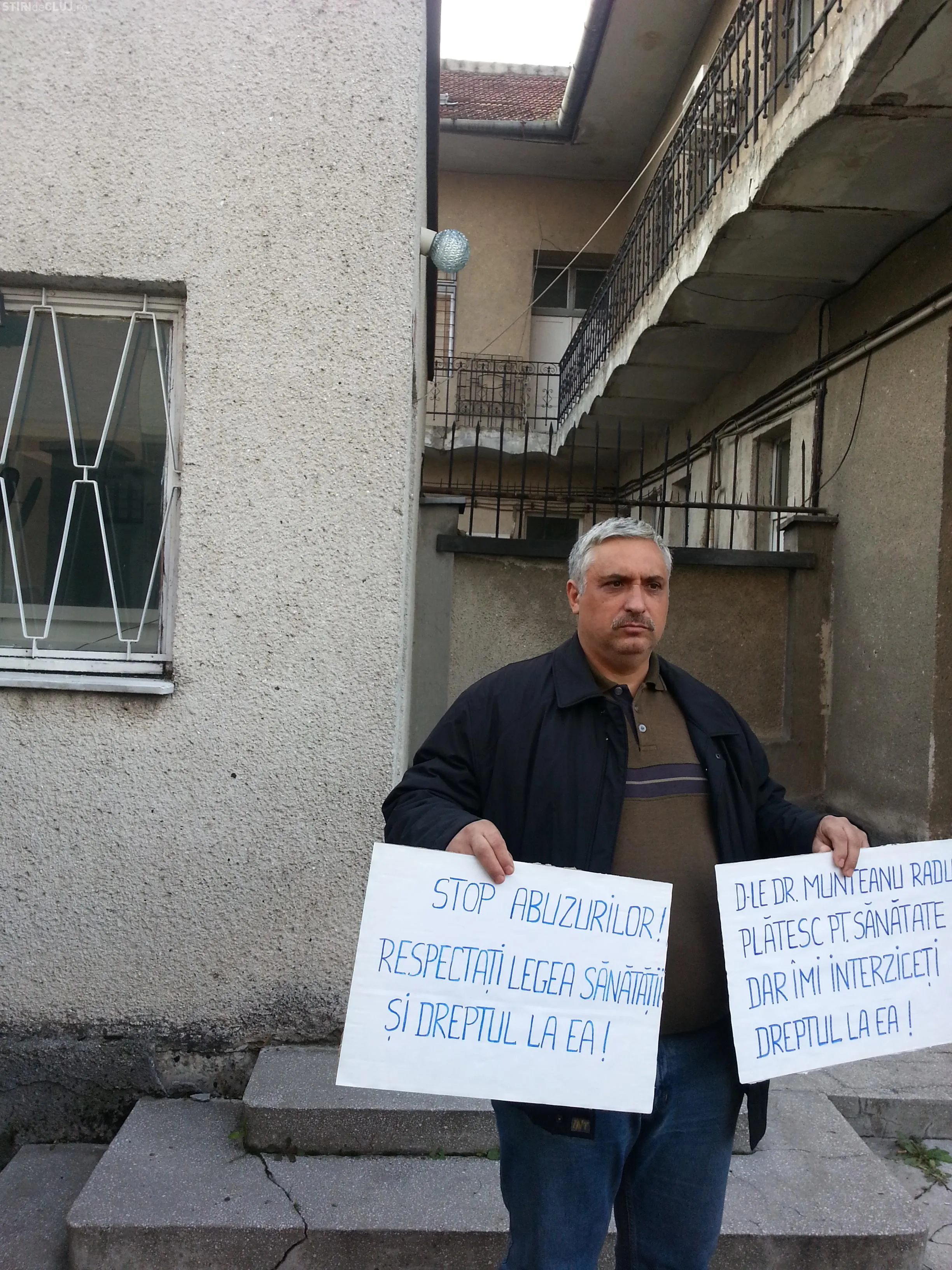 Agentul a avut asupra lui două pancarte pe care scria ”Stop abuzurilor! Respectaţi Legea Sănătăţii şi dreptul la ea” şi ”D-le dr. Muntean Radu, plătesc pentru sănătate, dar îmi interziceţi dreptul la ea”.