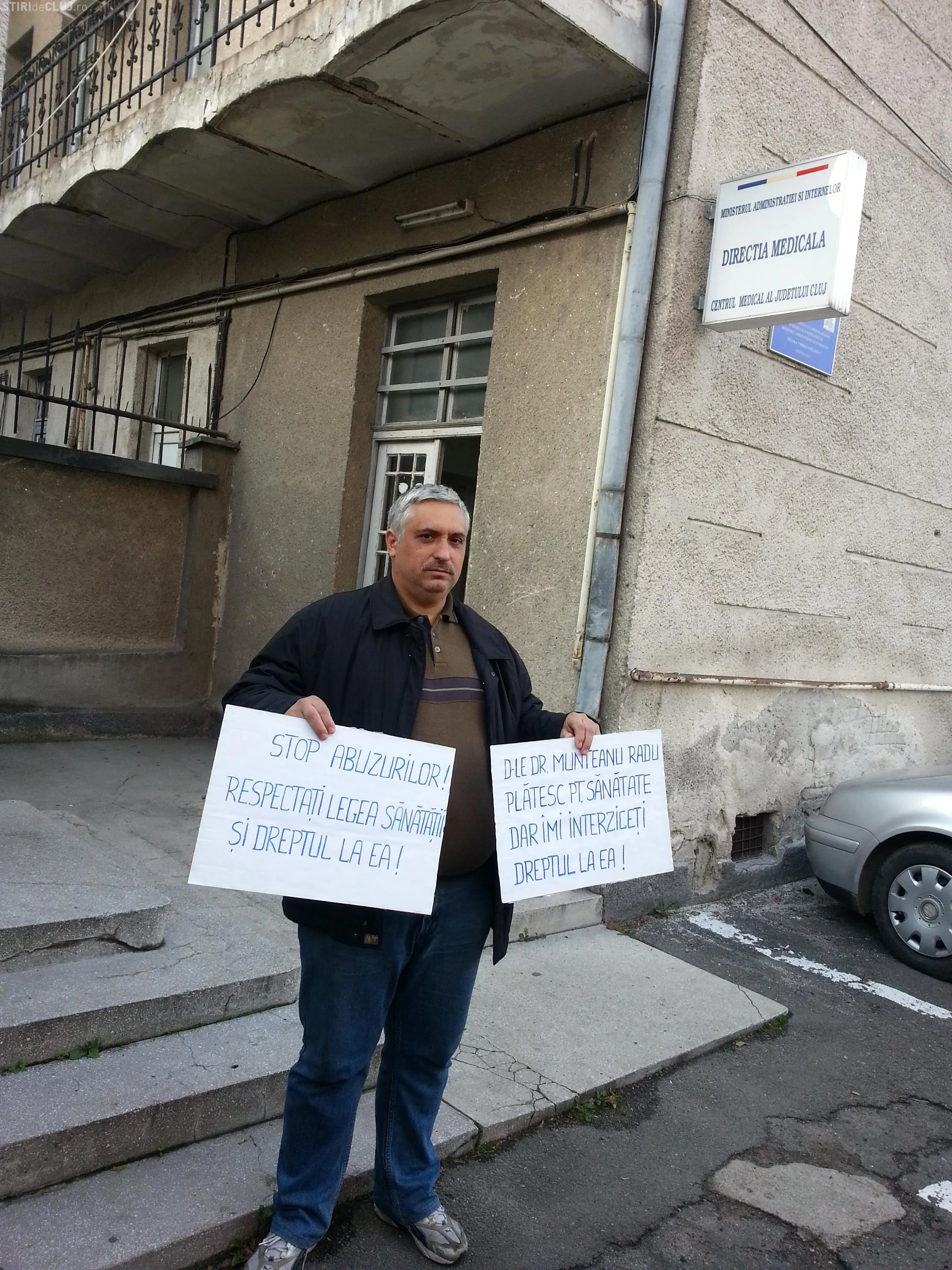 ”Am o singură nemulţumire. În 6 ianuarie 2012 mi-am schimbat medicul de familie, iar medicul şef al Centrului Medical Judeţean al IPJ Cluj, comisar şef dr. Radu Muntean, refuză să îmi elibereze de atunci fişa medicală în original la noul medic de familie. Trebuia să îmi elibereze conform legii în termen de 15 zile, dar au trecut peste 300 şi nu s-a întâmplat nimic. Am făcut demersuri la Colegiul Medicilor, la CJAS, la Direcţia Medicală a MAI, dar nu s-a luat nicio măsură. Am obosit să mă lupt atâtea luni pentru o fişă medicală şi am decis să protestez faţă de acest abuz. Dr. Muntean este mai presus de lege. Am nevoie de această fişă pentru ca medicul de familie să mă poată trata, să îmi poată prescrie medicamente, pentru că el nu ştie acum istoricul bolilor mele şi trebuie să ştie ce medicamente am nevoie pentru afecţiunile de care sufăr”, a spus Sever Legian. Agentul a promis că va protesta în fiecare zi până când problema lui va fi rezolvată.