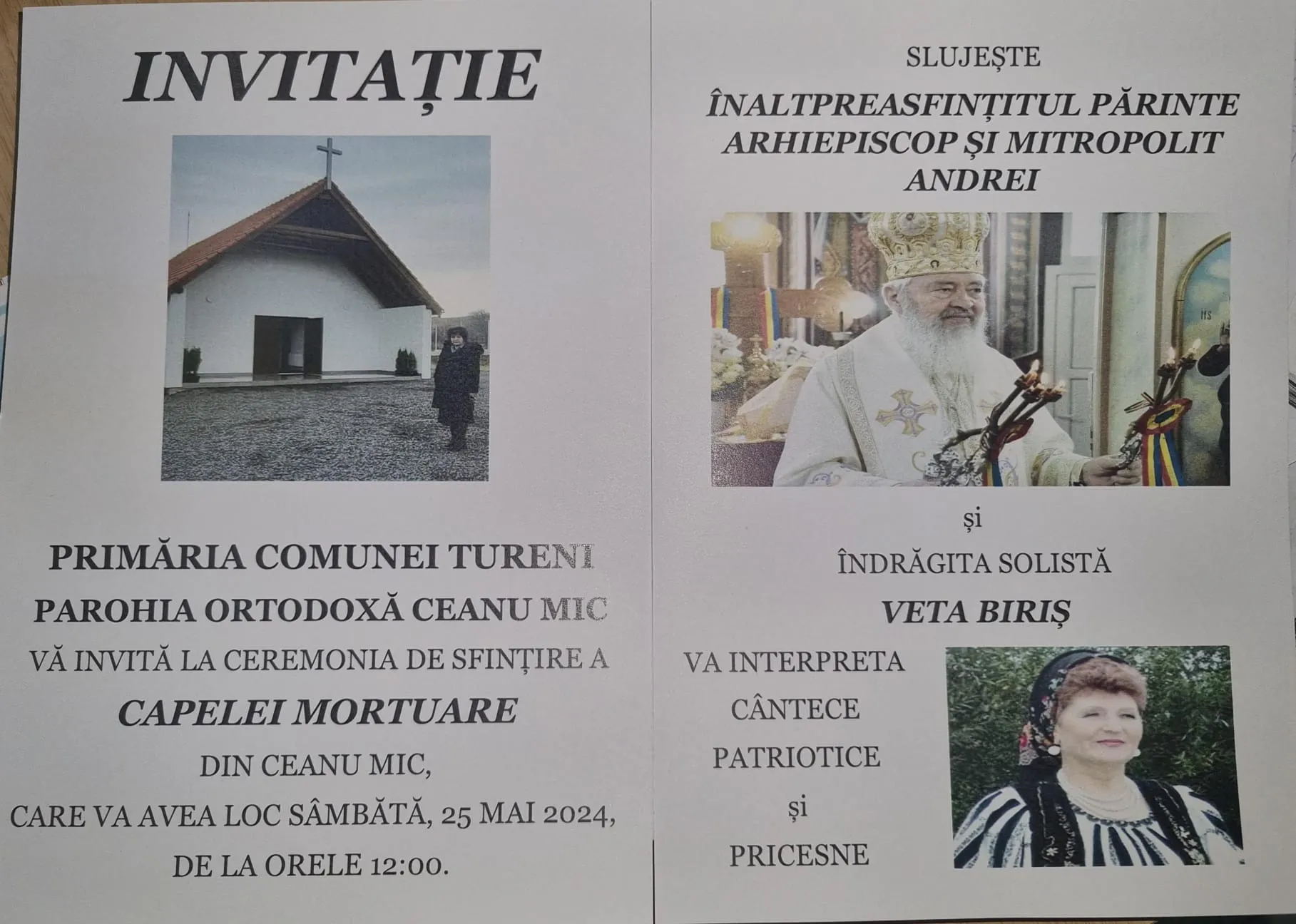 Primărița comunei Tureni Daniela Elena Mănăilă invită locuitorii din localitate, în număr cât mai mare, la un eveniment...mai puțin obișnuit! Ceremonia de sfințire și inaugurare a Capelei Mortuare din satul Ceanu Mic, aparținând comunei Tureni. Și pentru ca evenimentul să fie cât mai festiv, primăria a decis să aducă și invitați de seamă: Veta Biriș va cânta la ceremonie câteva pricesne, dar și cântece patriotice.