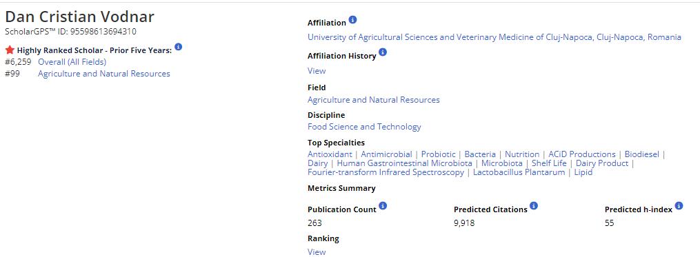 Profesorul, care predă Gastronomie Moleculară și Biotehnologii alimentare în cadrul Facultăţii de Ştiinţa şi Tehnologia Alimentelor de la USAMV Cluj-Napoca, apare în top oameni de știință din lume în Domeniul Agricultură și Resurse Naturale, la Disciplina Știința și Tehnologia Alimentelor, fiind clasat pe locul 99 printre cercetătorii de la această specializare.