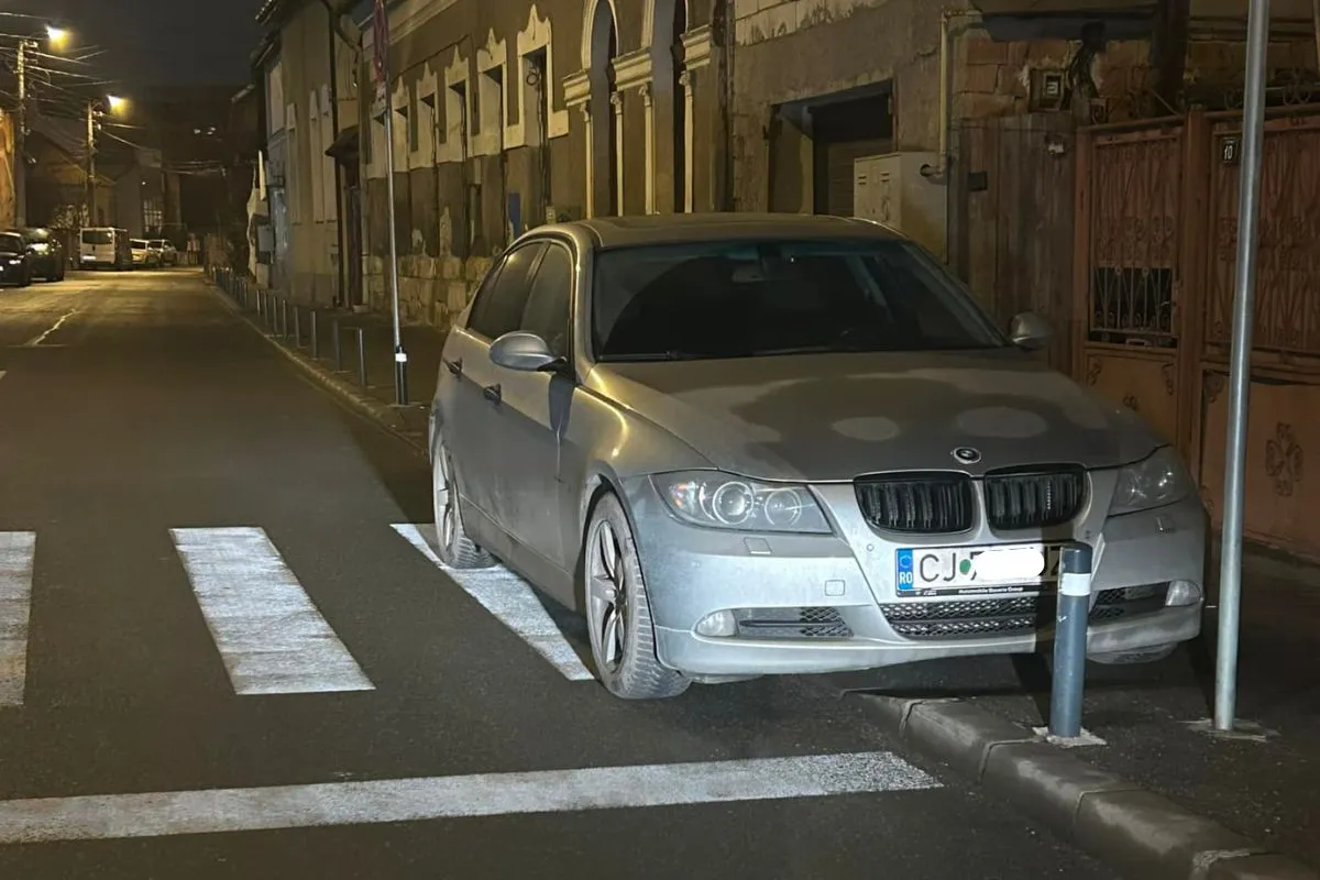 Un „șmecher” din Cluj-Napoca și-a parcat BMW-ul pe o trecere de pietoni din oraș: „Poliția de la secție știe care e situația, că săracii oameni nu au unde”