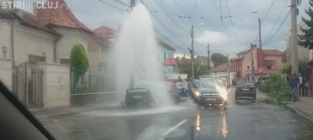 Apa a țâșnit cu presiune mare, inundând o porțiune din stradă.