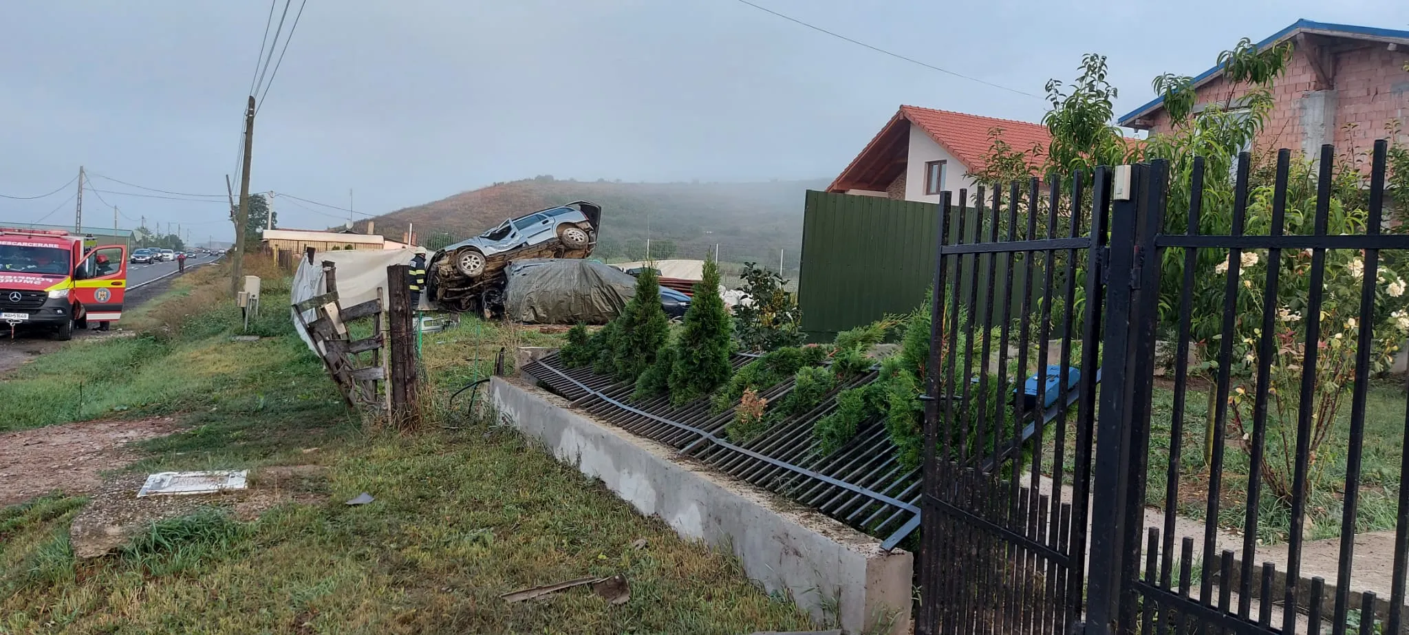 Un șofer a zburat cu mașina peste un gard în Căianu-Vamă, jud. Cluj, și s-a răsturnat peste alt autoturism - FOTO