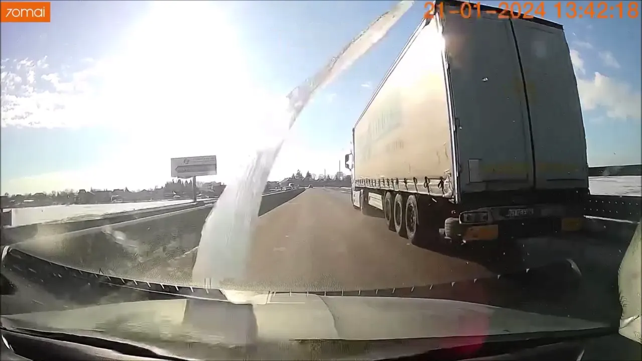 Conducătorul auto a ajuns lângă un TIR, care circula pe prima bandă, iar de pe remorcă s-a desprins o bucată mare de gheață. Incidentul a fost filmat și se vede cum parbrizul s-a făcut praf. Șoferul a avut prezență de spirit și nu s-a panicat, oprind ulterior.