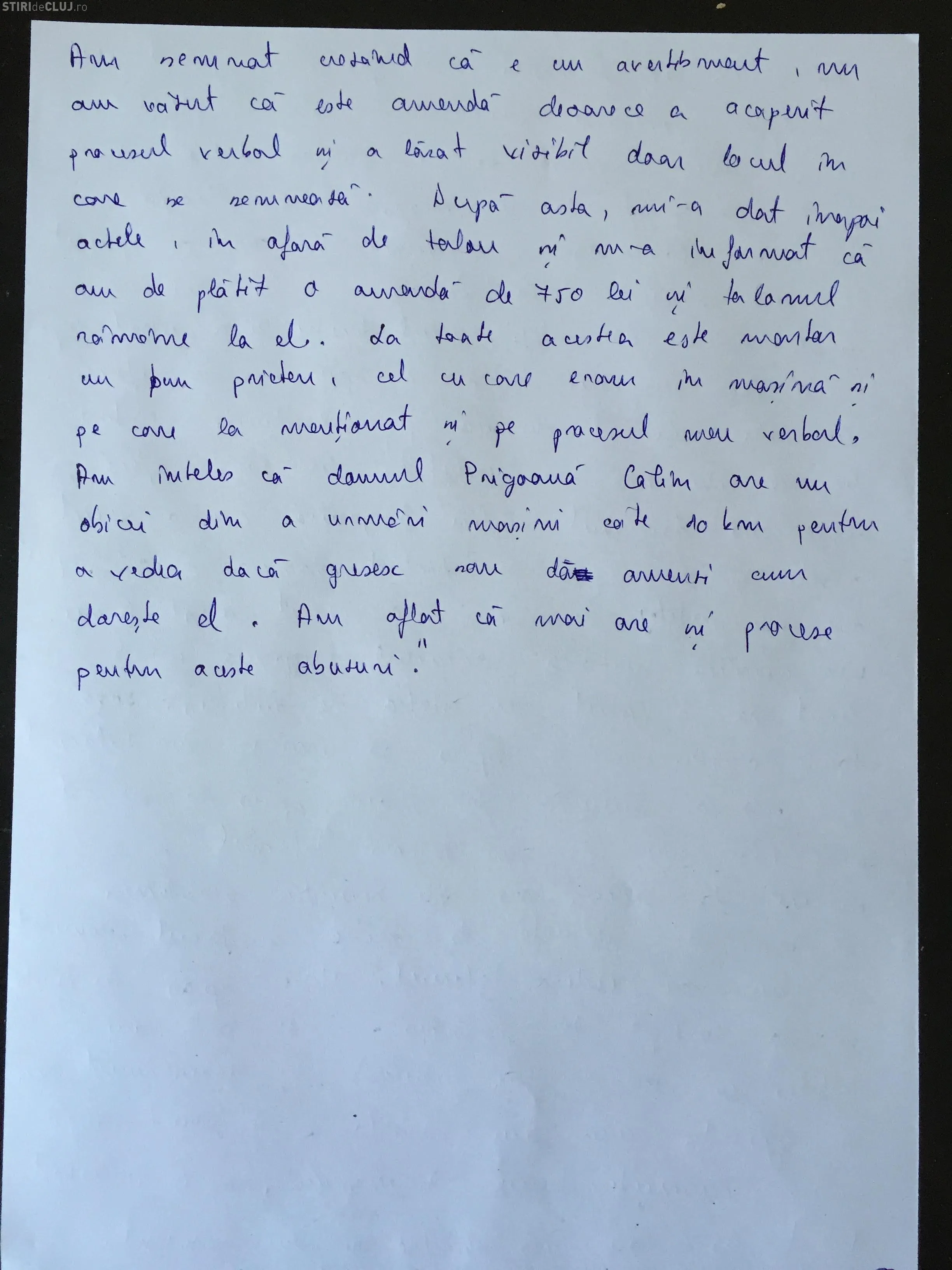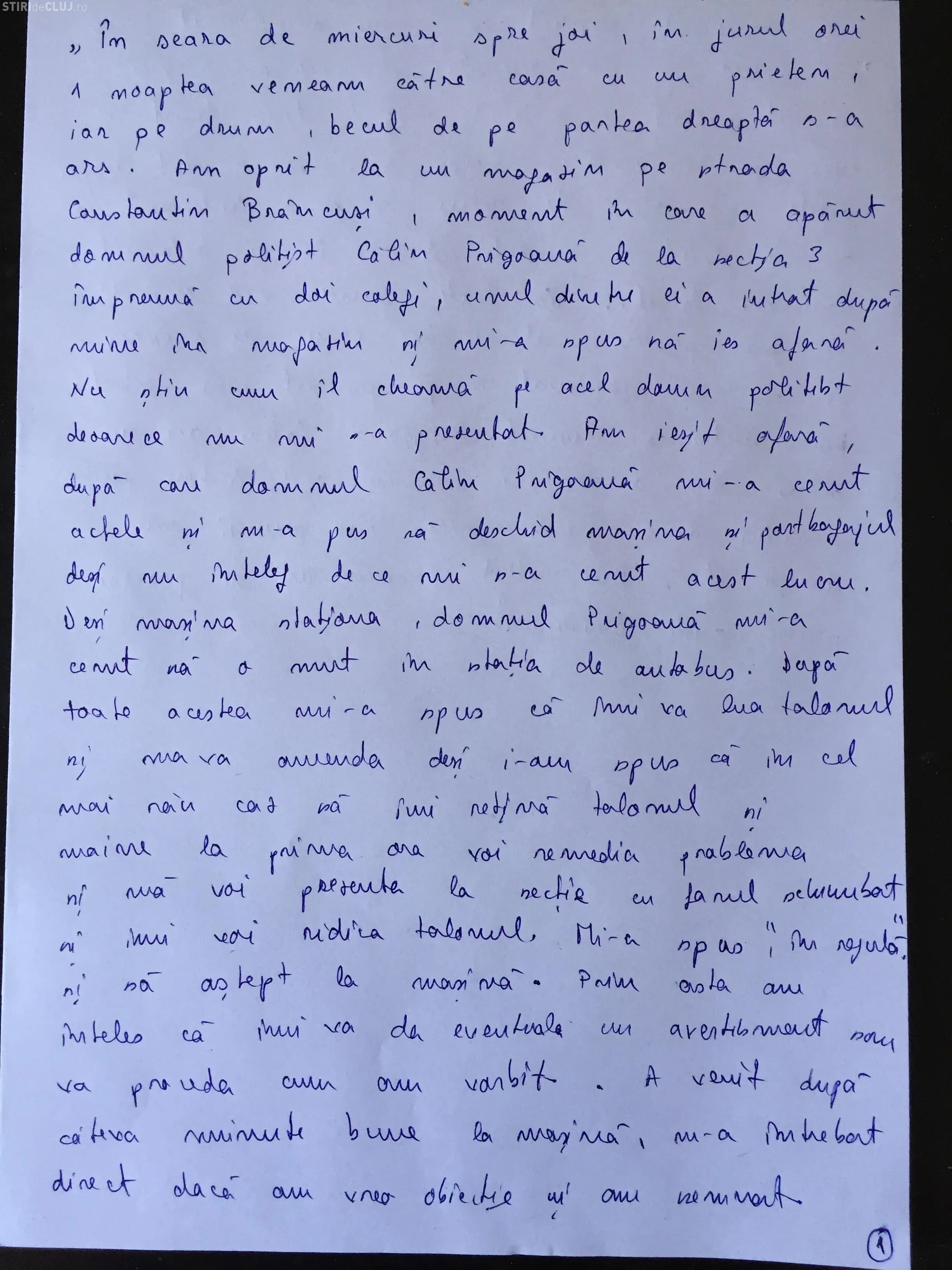 ”Am ieșit afară, după care domnul Călin Prigoană mi-a cerut actele și mi-a spus să deschid mașina și portbagajul, deși nu înțeleg de ce mi s-a cerut acest lucru. Deși mașina staționa, domnul Prigoană mi-a cerut să o mut în stația de autobus. După toate acestea mi-a spus că îmi va lua talonul și mă va amenda deși i-am spus că în cel mai rău caz să îmi rețină talonul și mâine, la prima oră, voi remedia problema și mă voi prezenta la secție cu farul schimbat și îmi voi ridica talonul. Mi-a spus ”în regulă” și să aștept la mașină”, a relatat bărbatul.