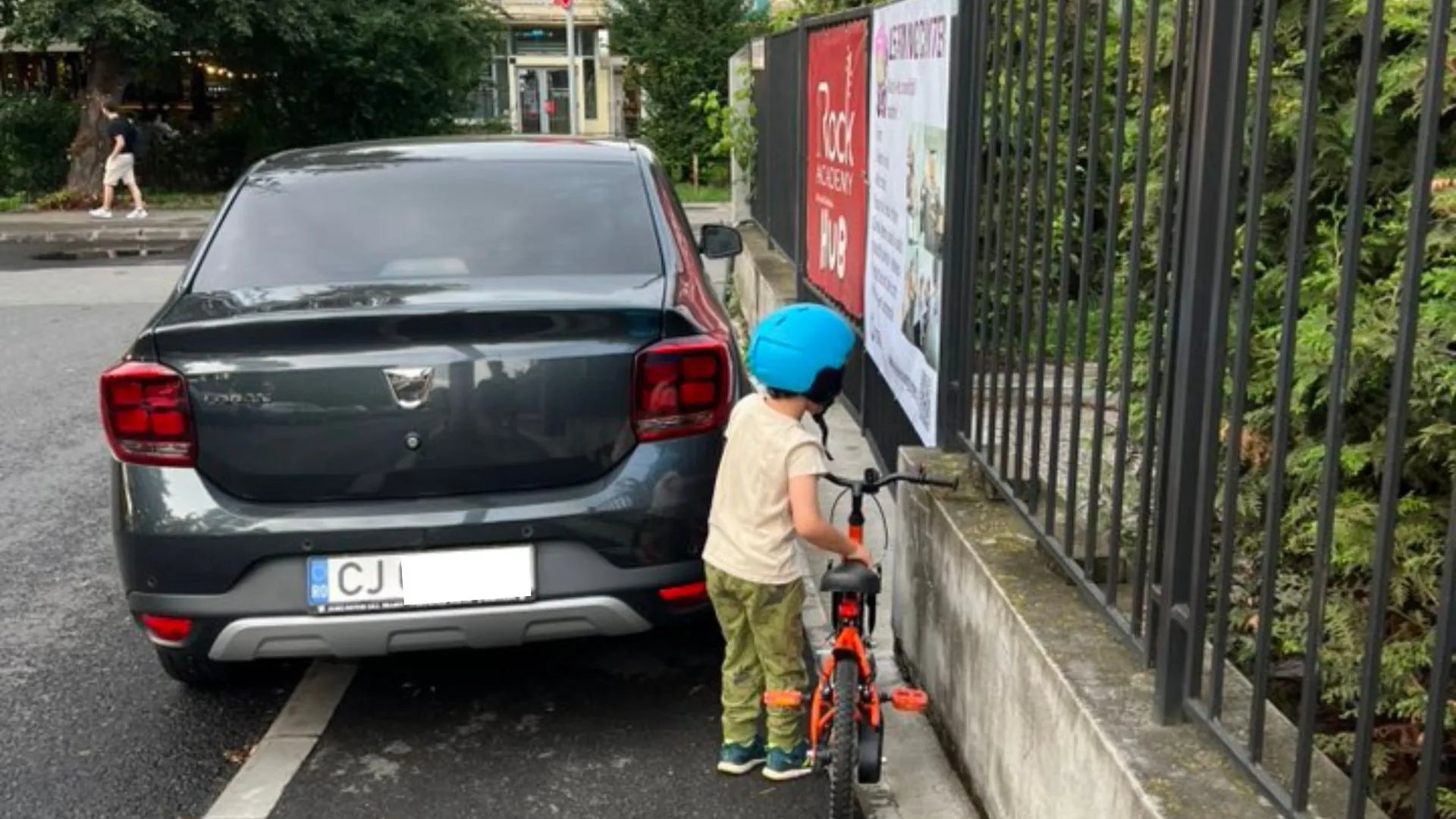 Un șofer din Cluj și-a parcat mașina pe trotuar, blocând complet accesul pietonilor. Un copilaș cu bicicleta încearcă să treacă, dar... n-are pe unde