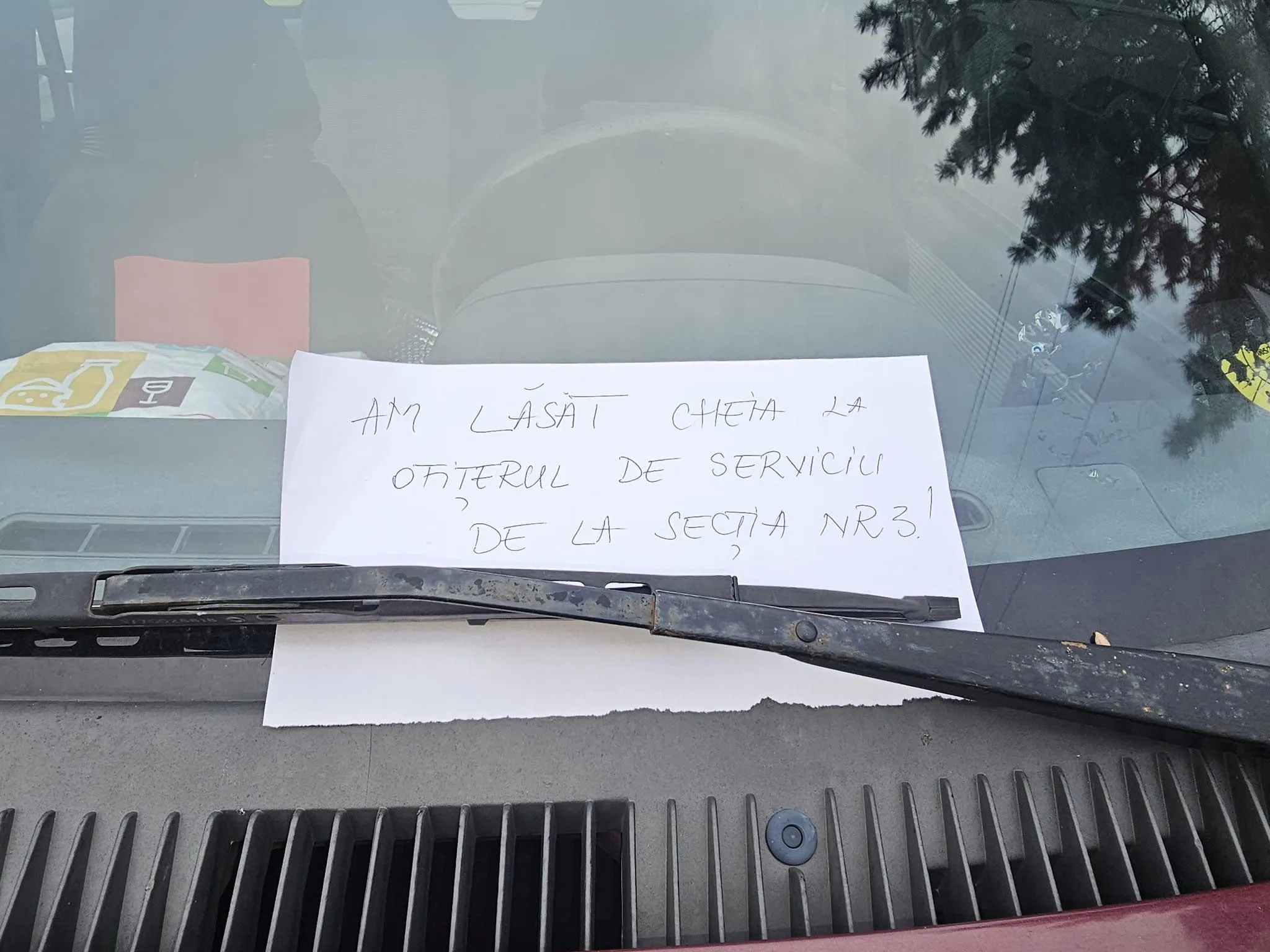 ”Am lăsat cheia la ofițerul de serviciu de la Secția 3!”, a scris clujeanca pe un bilețel lăsat pe bord. Aceasta ne-a contactat pentru a ne relata că proprietarul și-a uitat cheia în ușă și oricine putea intra pentru a fura bunurile din interior.