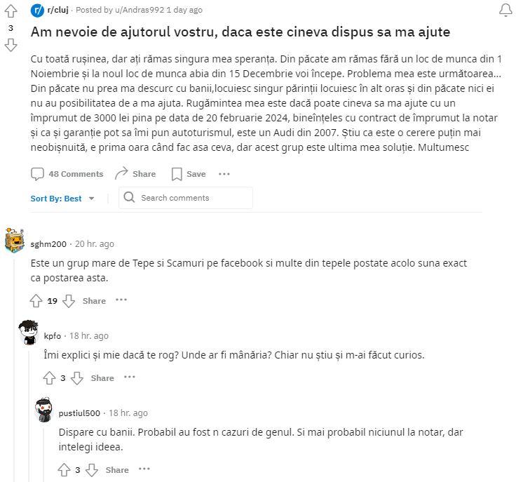 ”Cu toată rușinea, dar ați rămas singura mea speranță. Din păcate am rămas fără un loc de munca din 1 Noiembrie și la noul loc de munca abia din 15 Decembrie voi începe. Problema mea este următoarea... Din păcate nu prea mă descurc cu banii, locuiesc singur părinții locuiesc în alt oraș și din păcate nici ei nu au posibilitatea de a mă ajuta. Rugămintea mea este dacă poate cineva sa mă ajute cu un împrumut de 3000 lei pâna pe data de 20 februarie 2024, bineînțeles cu contract de împrumut la notar și ca și garanție pot sa îmi pun autoturismul, este un Audi din 2007. Știu ca este o cerere puțin mai neobișnuită, e prima oară când fac așa ceva, dar acest grup este ultima mea soluție. Mulțumesc”, a relatat un tânăr, pe Reddit.