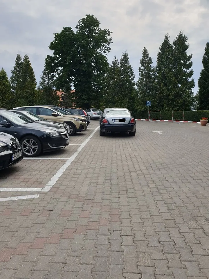 În imagine apare un frumos Rolls Royce care a fost parcat în fața altor autoturisme, probabil pentru a nu risca să fie zgâriat.