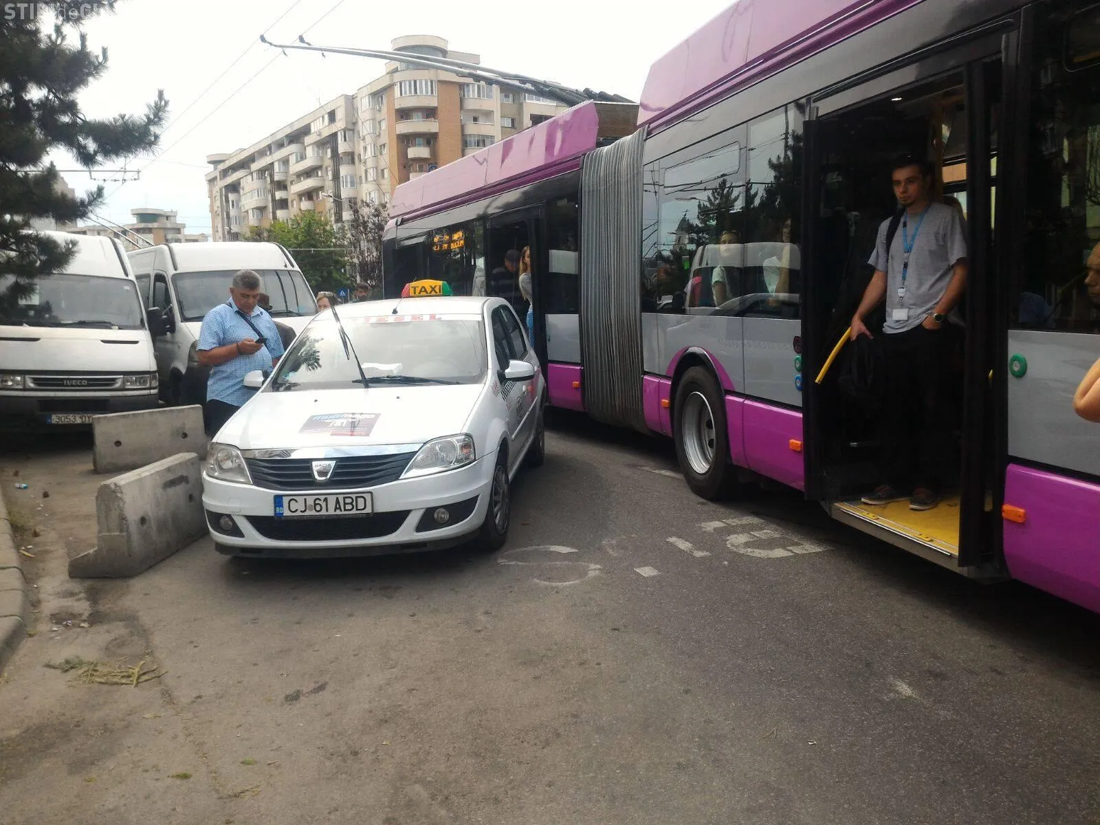 Taximetristul a parcat într-un loc nepermis, în alveola creată de Poliția Locală Cluj pentru a permite accesul mijloacelor de transport în comun.