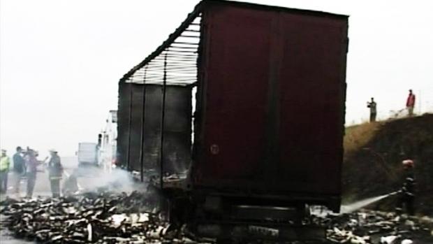 Autotrenul transporta vopsele şi alte materiale inflamabile și a luat foc într-o zonă populată. Incendiul a provocat şi o explozie, dar, din fericire, nimeni nu a fost rănit, şoferul reuşind să se salveze la timp.