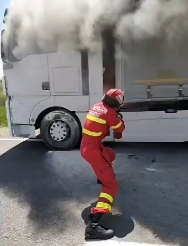 Un TIR a luat foc pe drumul Cluj-Oradea. Primii au ajuns la intervenție paramedicii, care au acționat cu stingătoarele până au venit pompierii- VIDEO