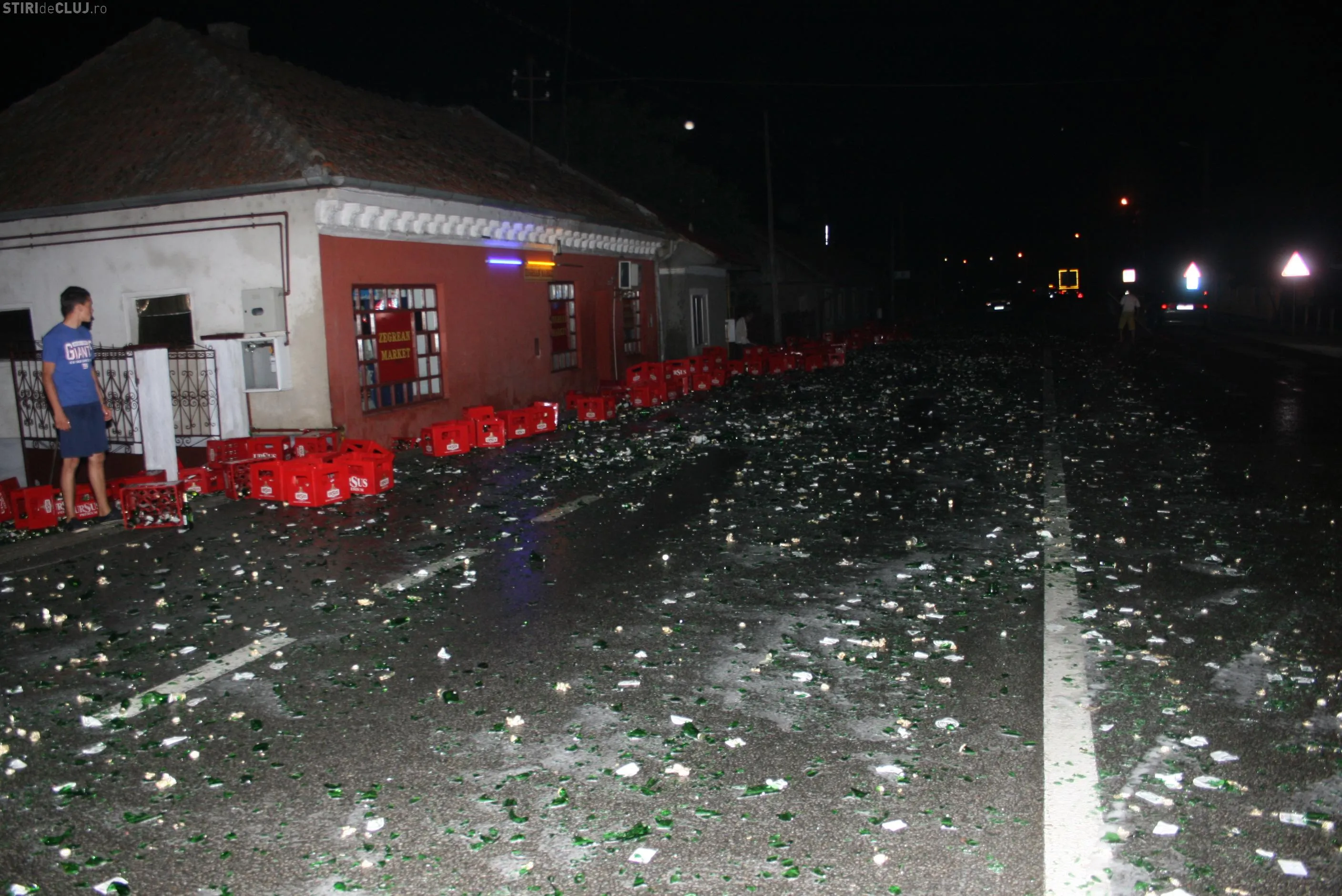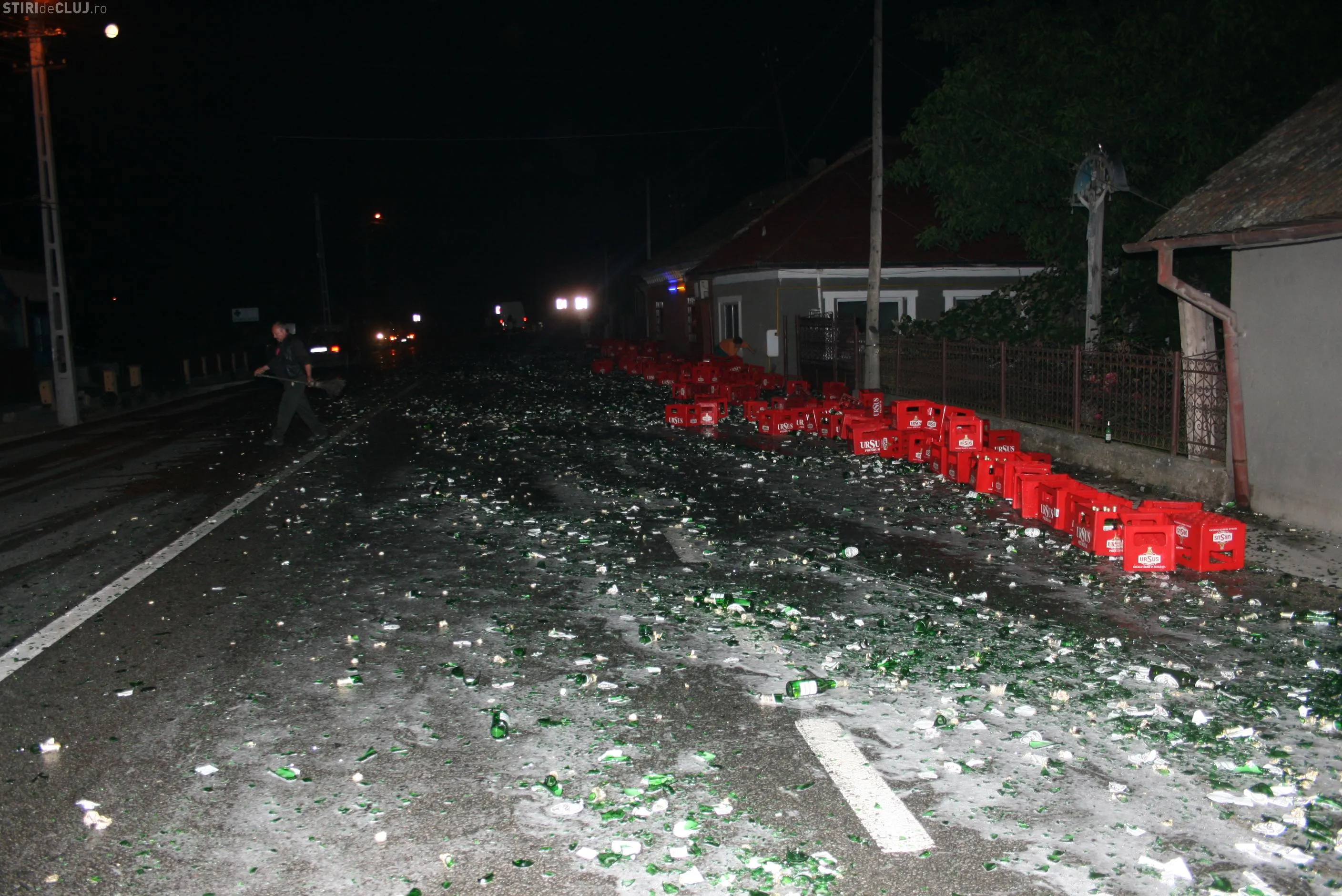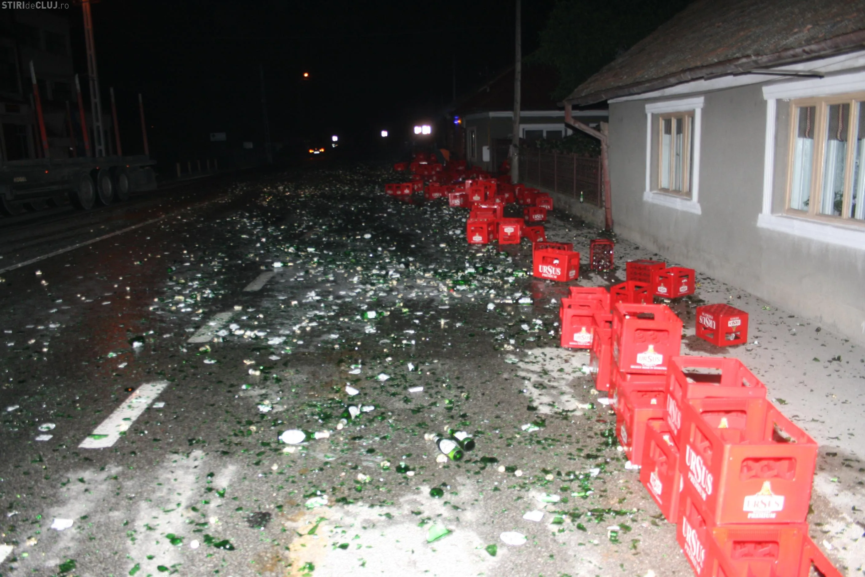 Soferul autotrenului circula sambata noaptea pe DN 1C spre Dej si transporta sute de lazi cu bere incarcate de la depozitul Fabricii Ursus din Cluj-Napoca. Barbatul nu a adaptat viteza la conditiile de drum si a intrat prea tare intr-o curba la stanga. Furgonul TIR -ului a intrat in balans si marfa s-a imprastiat pe carosabil.