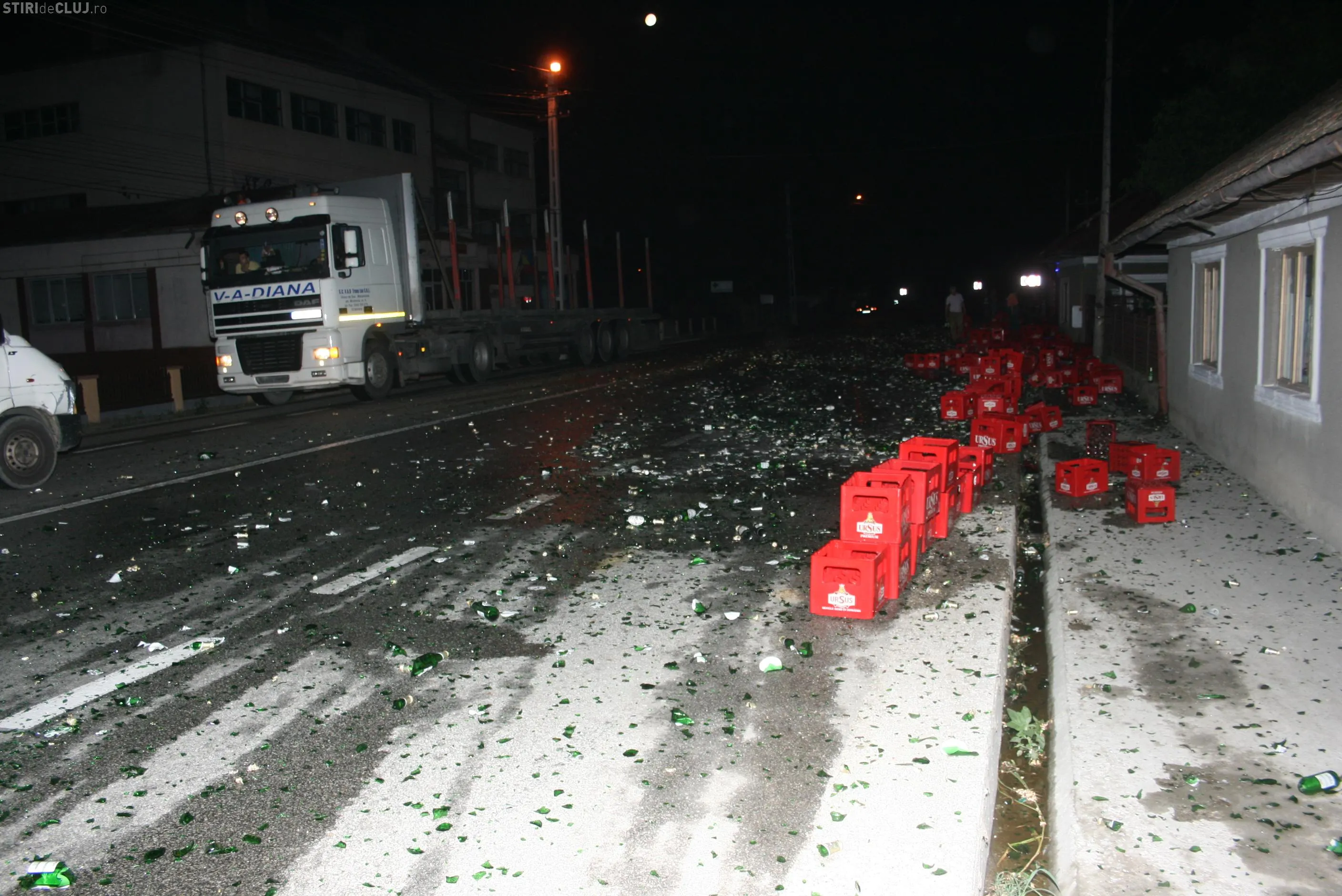 Un TIR care transporta mii de sticle de bere s-a rasturnat pe raza comunei Iclod. Drumul a fost acoperit cu cioburi pe aproximativ 50 de metri. Berea s-a revarsat si circulatia a fost blocata aproape doua ore.