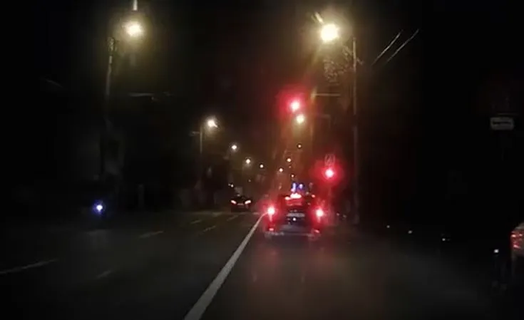 În doar câteva momente, același șofer a trecut și pe culoarea roșie a semaforului, riscând un accident grav. A frânat pentru a evita impactul cu un biciclist care circula regulamentar și apoi și-a continuat netulburat drumul deși semaforul nu-i permitea trecerea.