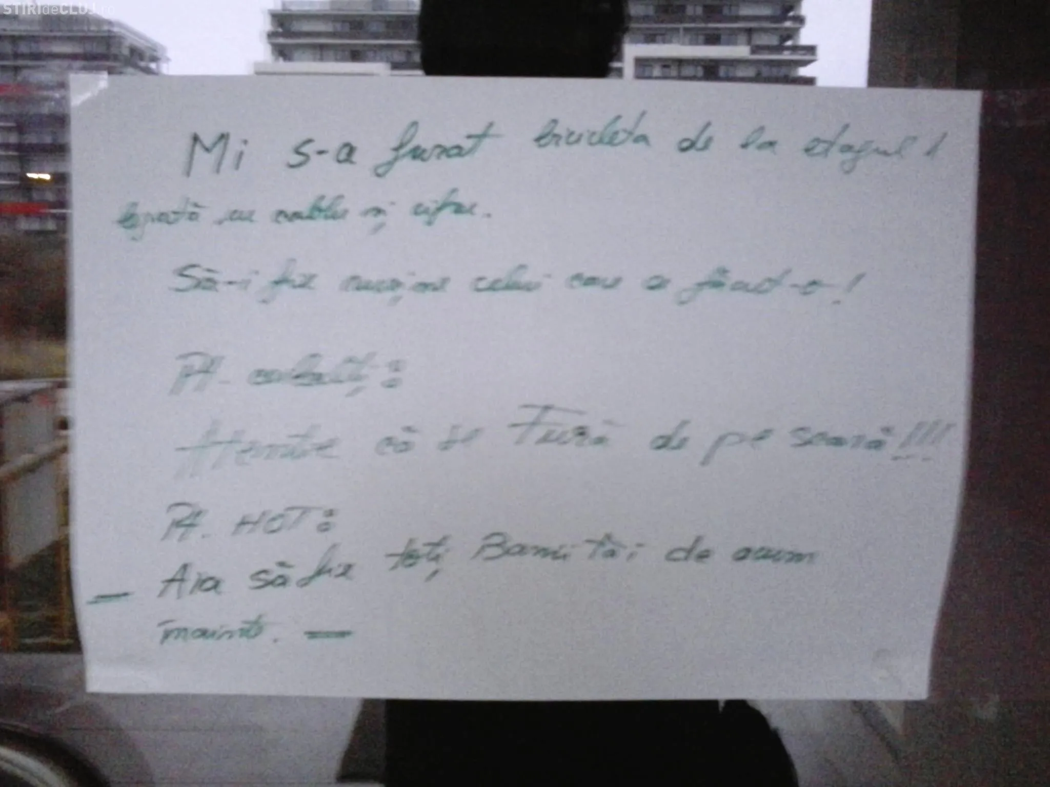 ”Mi s-a furat bicicleta de la etajul 1, legată cu cablu și cifru. Să-i fie rușine celui care a făcut-o. Pentru ceilalți: Atenție că se fură de pe casa scării!!!