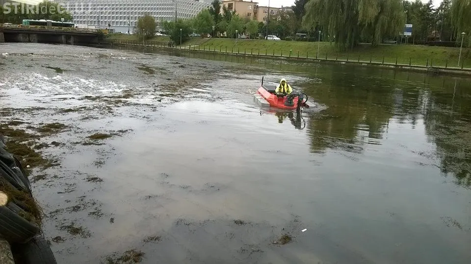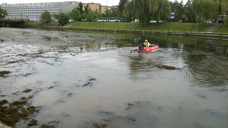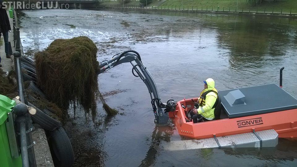 Utilajul a făcut câteva zile probe, iar joi dimineața a intrat în râul Someș pentru a recolta vegetaţia acvatică din zona podului Garibaldi-Sala Sporturilor.