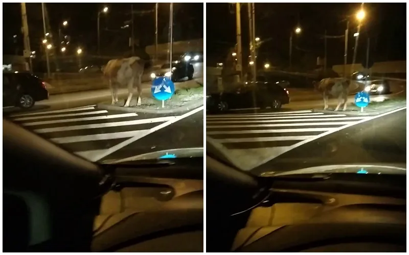 O vacă a fost filmată în sensul giratoriu din Zorilor, abandonată sau uitată de proprietar pe unul dintre câmpurile din zonă.