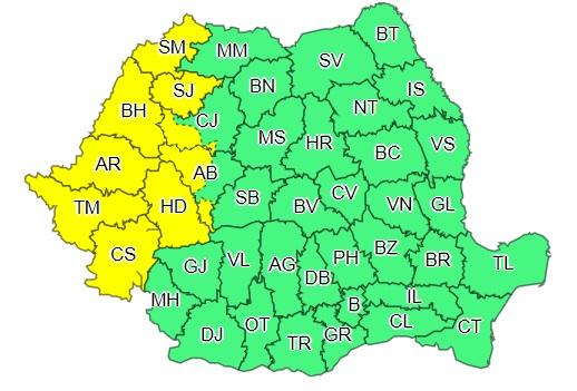 În Banat, Crișana, local în Maramureș și în nord-vestul Transilvaniei, temporar instabilitatea atmosferică va fi accentuată și se va manifesta prin averse torențiale, frecvente descărcări electrice, intensificări ale vântului, vijelii și grindină. Cantitățile de apă vor depăși 25 l/mp și pe arii restrânse 40...60 l/mp.