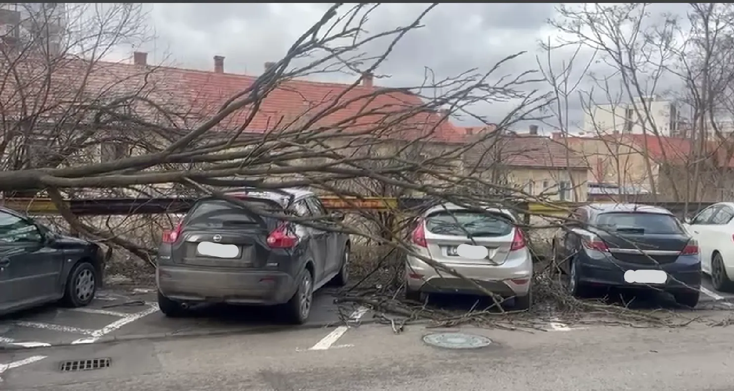 Vântul a făcut prăpăd în Cluj-Napoca! Un copac a căzut peste trei mașini - VIDEO