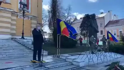 Vântul puternic i-a oprit discursul, pentru că i-a picat eșarfa tricoloră pe care o poartă de fiecare dată la piept, în timpul evenimentelor oficiale. Eșarfa a căzut la pământ, iar apoi steagurile au fost luate pe sus.