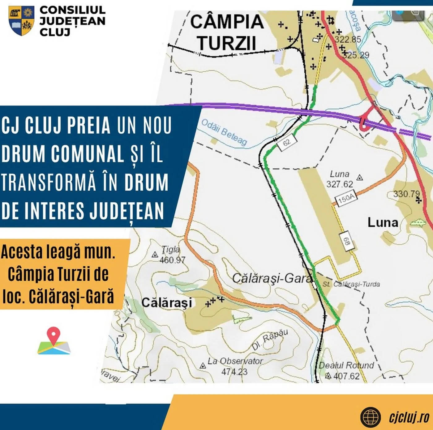 „După aprobarea de către consiliile locale ale municipiului Câmpia Turzii și ale comunelor Luna și Călărași a transmiterii tronsoanelor de drum în domeniul public al Județului Cluj și ulterior încheierii proceselor-verbale de predare-primire, vor fi inițiate demersurile pentru încadrarea în categoria funcțională a drumurilor de interes județean a drumului care face legătura între municipiul Câmpia Turzii și reședința comunei Călărași”, au mai transmis reprezentanții CJ Cluj.